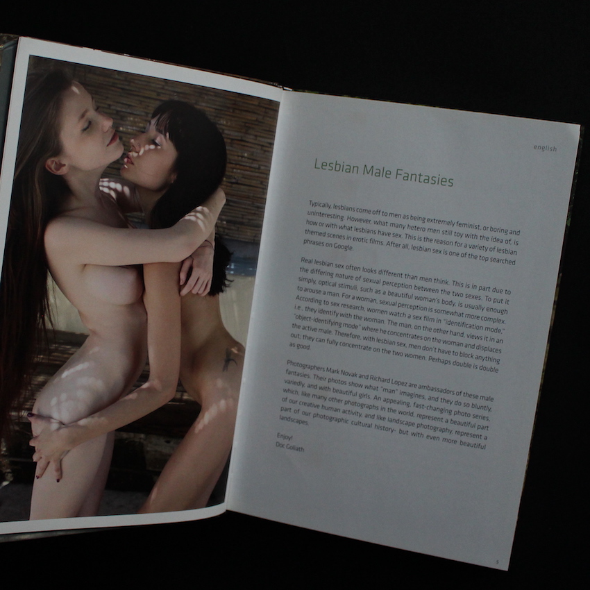 本書は、フォトグラファーMark NovakとRichard Lopez撮影による写真集『Young Lesbian Girlfriends』。エロティックな作品集を数多く刊行してきたGoliathからの一冊で、タイトルの通り男性が描くレズビアンの女性たちの世界観をビジュアルにした作品で構成されています。2名のカップルの女性たちが演ずる様々な同性愛感が、明るい晴天下のもとで健康的なイメージで創出されています。Mark Novakは、Goliathからも他にも刊行しており、『Young Casting Girls: ready for action』『Sweet Beauties』『Young Nylon Beauties: Hot & Naked』などがあります。4ヶ国語併記。