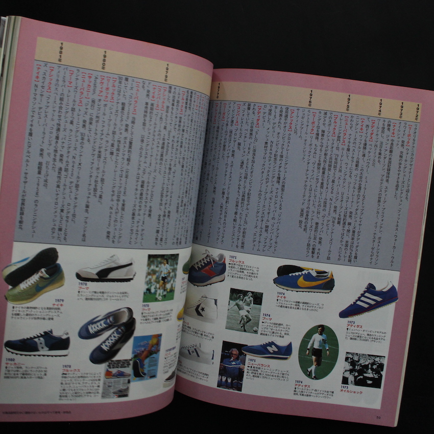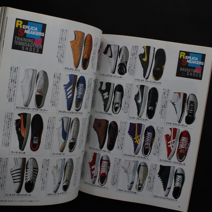 本書は、ヤング向けで1986年創刊、現在まで続くメンズ雑誌『Fineboys』のSpecial Issueとして95年に刊行された『スニーカー完全読本 ナイキのすべて』。アメカジブーム、スニーカーブームの中で、90年代に数多く雑誌でも紹介された「スニーカー特集」ですが、こちらは前半50ページくらいまではナイキ特集となっており、数々の歴代スニーカーから、ナイキのオレゴン本社、さらにはシューズ・デザイナーにもインタビューした凝った内容となっており、マニアックな情報も多数収録されている他、若かりし藤原ヒロシも登場します。その他アディダス、コンバースの名品なども紹介されており、写真も充実した一冊となっています。