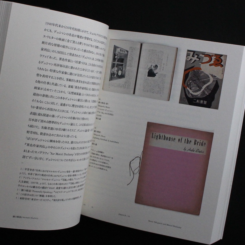 本書は、2011年に千葉市美術館で行われたエキシビジョン『瀧口修造とマルセル・デュシャン / Shuzo Takiguchi and Marcel Duchamp』を機に刊行されたカタログ。小ぶりな単行本サイズですが、350ページ近くにも及ぶ大著で、イラスト・図版も大変充実しております。余白たっぷりの白ベースのデザイン(森大志郎)も洒落ています。前衛美術、詩、写真、映画、デザイン、音楽など幅広い分野の芸術の現場に立ち会い、作家たちと交流を持ちながら評論活動を行なってきた瀧口修造。60年代以降は、批評からは距離を置き、文筆や造形活動を行うようになり美術家としても活躍。写真では大辻清司や岡上淑子ら多くのアーティストに多大なる影響を及ぼしました。そんな瀧口が、58年にサルバドール・ダリを訪れた際に、巨匠マルセル・デュシャンと運命的な出会いを果たし、以降は書簡や作品を通じて交流を継続。それは68年のデュシャン没後も、精神的な絆とつながりを保ち続けていたと言います。本展では、そうした瀧口とデュシャンの交流を、様々な作品や書簡等を通して紹介しています。