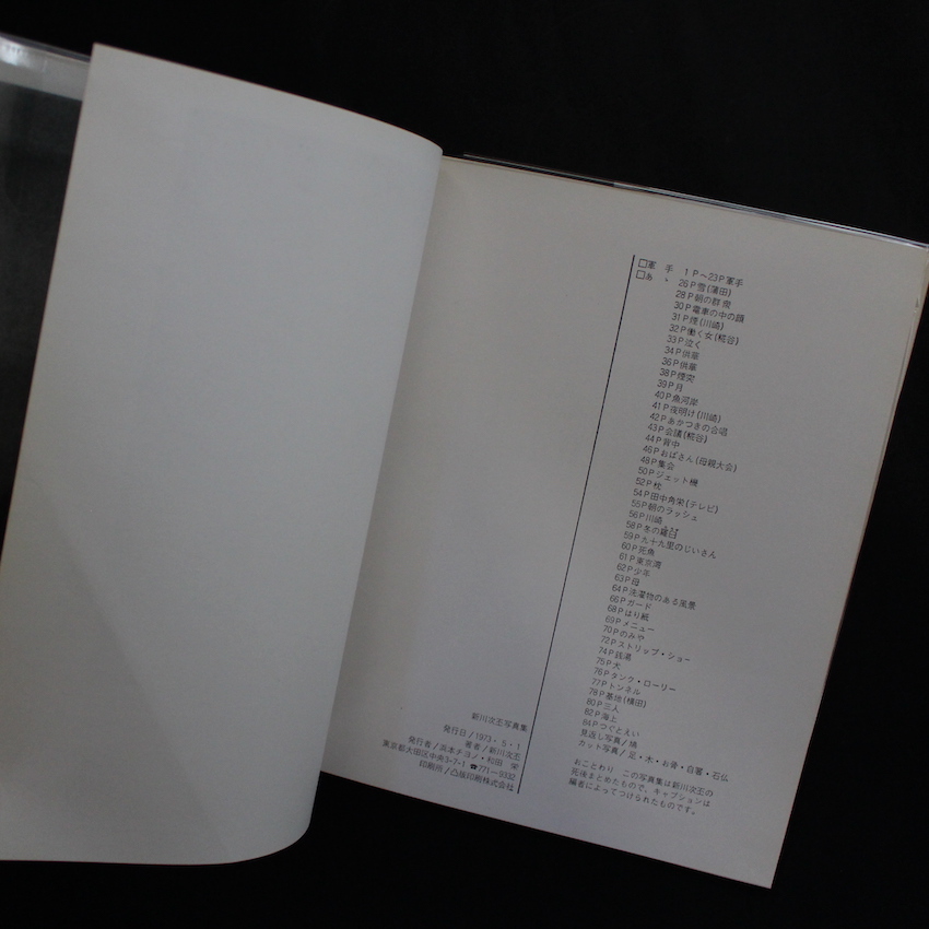 A collection of works by Japanese photographer Tsuguhisa Shinkawa. Although he is an unknown photographer, this book is highly popular among photo book collectors. This photo book was published by his family members the year after his death, and contains over 80 images. In 1972, he was swept away by the waves at Minamihama, Kujukuri, and passed away at the age of 33. At the end of the book, there are comments from his wife, older brother, older sister, and other acquaintances and friends. For example, there are descriptions such as "He had a crew cut and wore sandals or geta," "He loved sake and shochu," "He paid no attention to sumo masters or intangible cultural assets, and his main subjects were always ordinary people. It was the life of the ordinary people. He loved the slums." These somehow give a glimpse of Shinkawa's personality. The cause of his death and the style of his photography are reminiscent of the famous photographer Seiryu Inoue, who settled in Kamagasaki and was eventually drowned in the ocean off the coast of Okinawa and Amami. This is an unknown masterpiece, rich in sharp sensibility and visual depiction, including a series of photographs of the alleys of Ota Ward and Kawasaki, the workers and bars there, and even "work gloves" found on the side of the road.