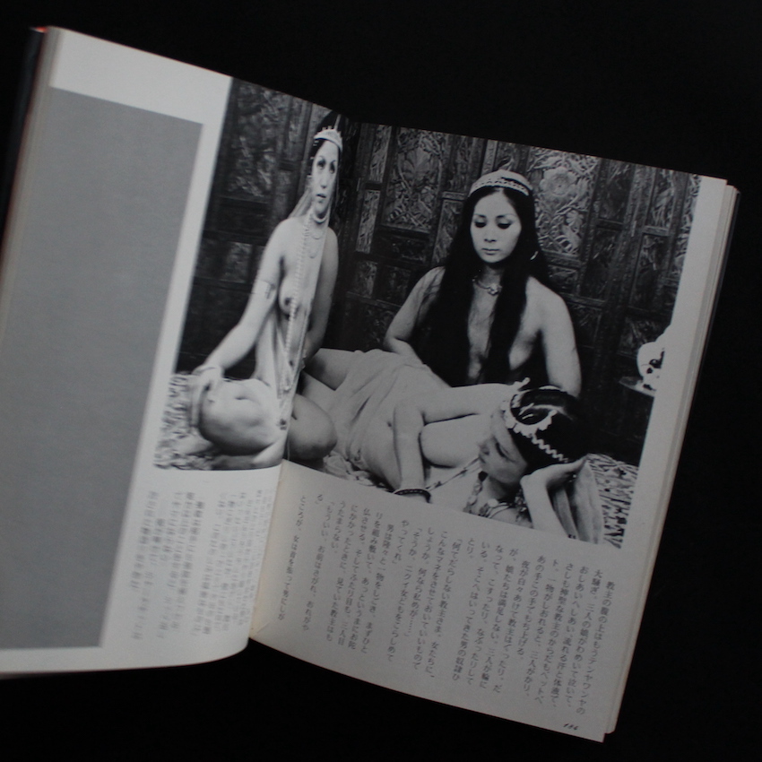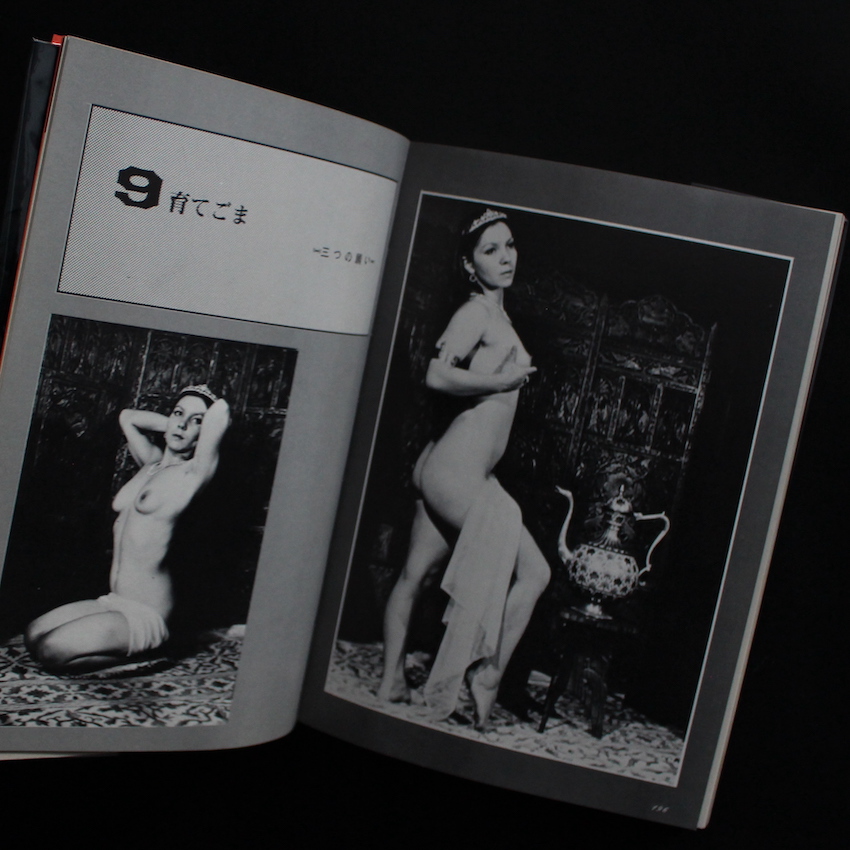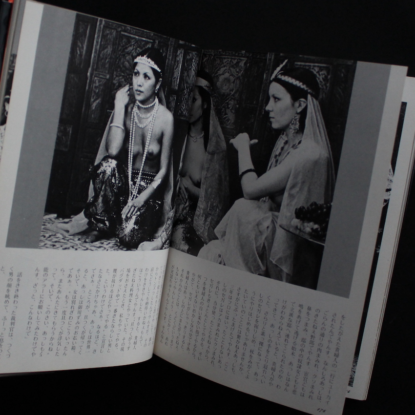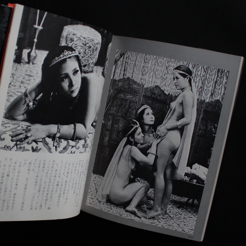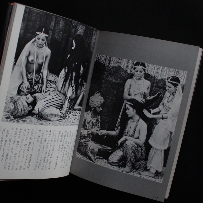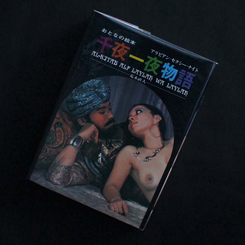 本書は、1960年代から70年代にかけて、数々の性やエロスをモチーフにした雑誌や作品集を刊行してきた清風書房より、1971年に刊行された作品集『千夜一夜物語 おとなの絵本 アラビアン・セクシーナイト』。タイトルの通り、千夜一夜物語を題材にとり、全く新しい視点から「大人の絵本」として編集された一冊です。アラビア人の性生活の知恵やことわざ、性愛に関する回教の教えや掟などが集録されおり、恍惚シーンの再現なども試みて、イラスト・写真も充実した内容となっています。