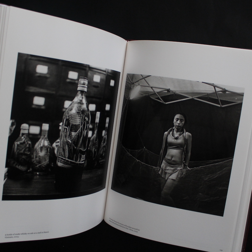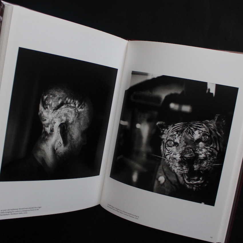 イギリスに生まれ、現在はタイを拠点に活動する写真家パトリック・ブラウンの作品集『Trading to Extinction』。国際的な報道写真家として知られ、特にアジアを中心に野生動物の違法取引問題を10年以上にわたって取材してきたブラウン。作品はニューヨーク・タイムズやタイム誌などでも取り上げられています。本書は、密猟されたゾウの象牙、サイの角、トラの骨などが密売される現場を捉えた衝撃的な写真集。中国、タイ、ラオス、ベトナムといった国々の市場や港での実地撮影を通して、動物たちがいかに商品として扱われているかを静謐なモノクロで記録しています。ちなみに、イギリスで開催された違法野生生物取引に関する国際サミットに合わせて刊行され、犯罪経済と倫理の問題を視覚的に問いかける作品として高い評価を受けました。環境問題と報道写真の交差点に立つドキュメンタリーの名著。