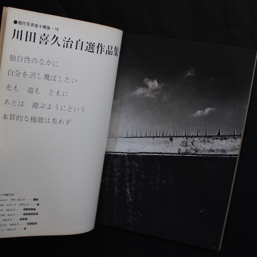 本書は、1960年代半ばに写真同人社が発行していた写真誌『カメラ時代 1966年10月 / Camera Age October 1966(特集 - 川田喜久治自選作品集)』。前身は1955年創刊の『フォトコンテスト』。写真同人社と言えば、東松照明のファーストブック『〈11時02分〉 Nagasaki』の版元で有名ですが、翌67年に会社が傾いてしまい、この雑誌もおそらく1967年以降は発行されていないようです。66年度は、奈良原一高(1月)、長野重一(2月)、細江英公(3月)、佐藤明(4月)、今井寿恵(5月)、高梨豊(6月)、東松照明(7月)、石元泰博(8月)、横須賀功光(9月)と、当時の新鋭写真家の「自選作品集」と題した特集が組まれており、本書はその10月号で川田喜久治特集。30ページ強に渡って図版及び論考が収録されており、その他、内藤正敏「日本のミイラ」、多木浩二「石の文化」、シンポジウム<日本1966>(構成:和田勉)などの作品も素晴らしく、グラビア印刷も惹かれ る一冊です。(前半数ページ縁に少濡れシミあり、図版良好)