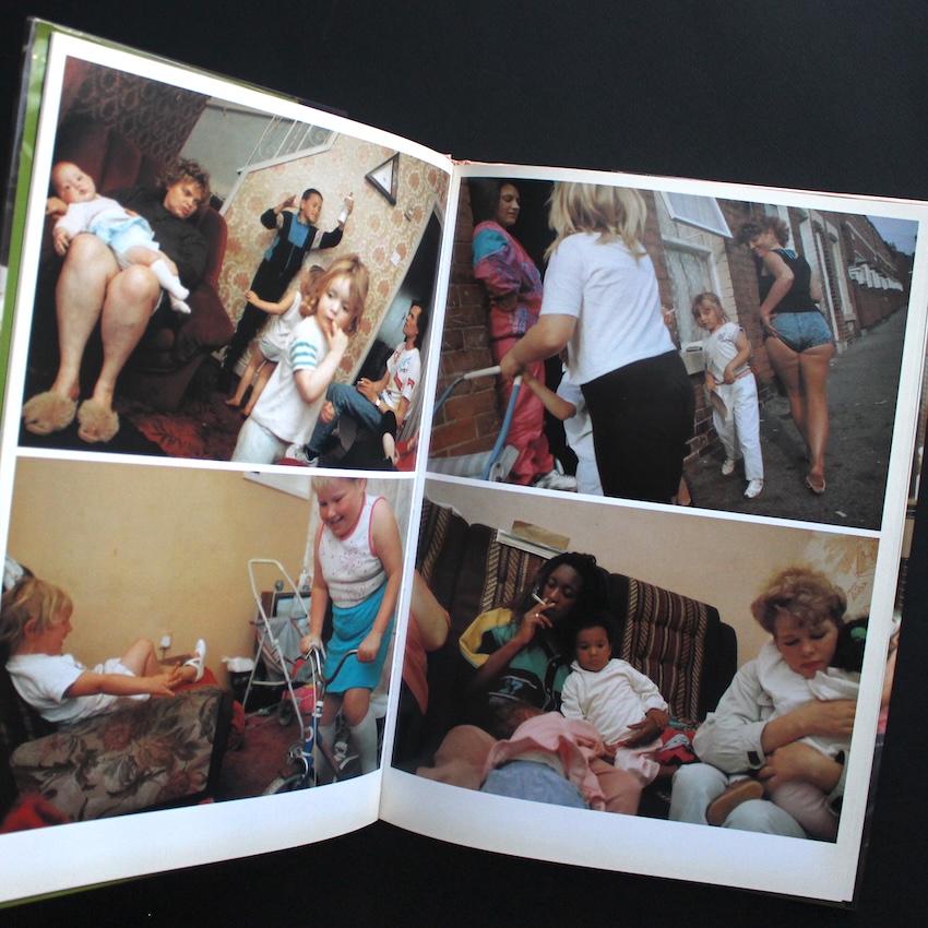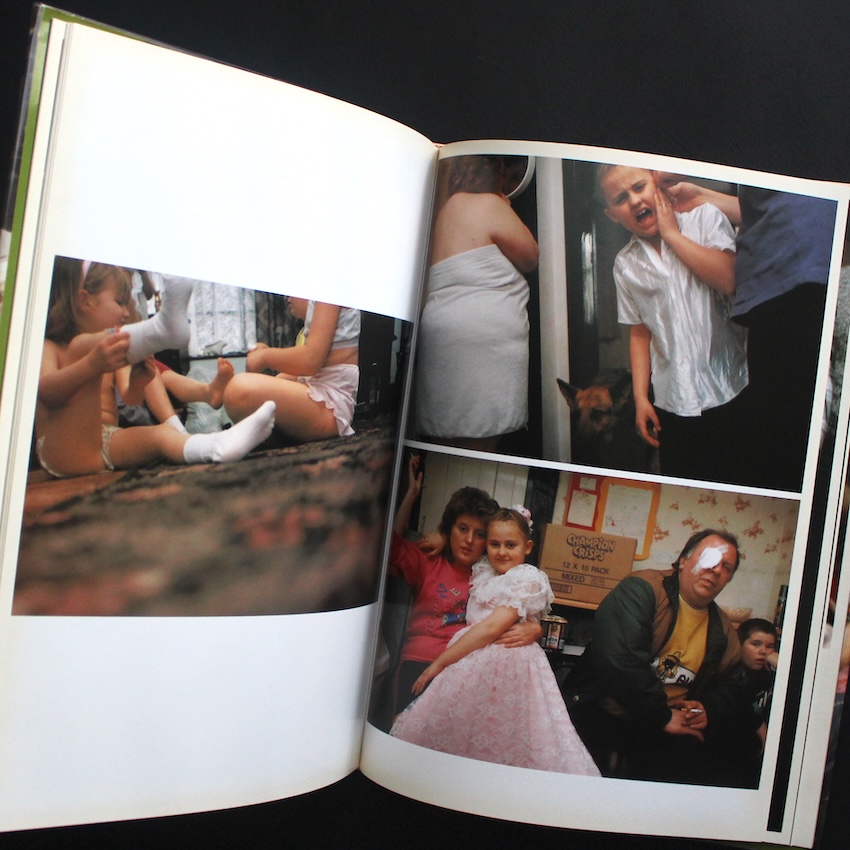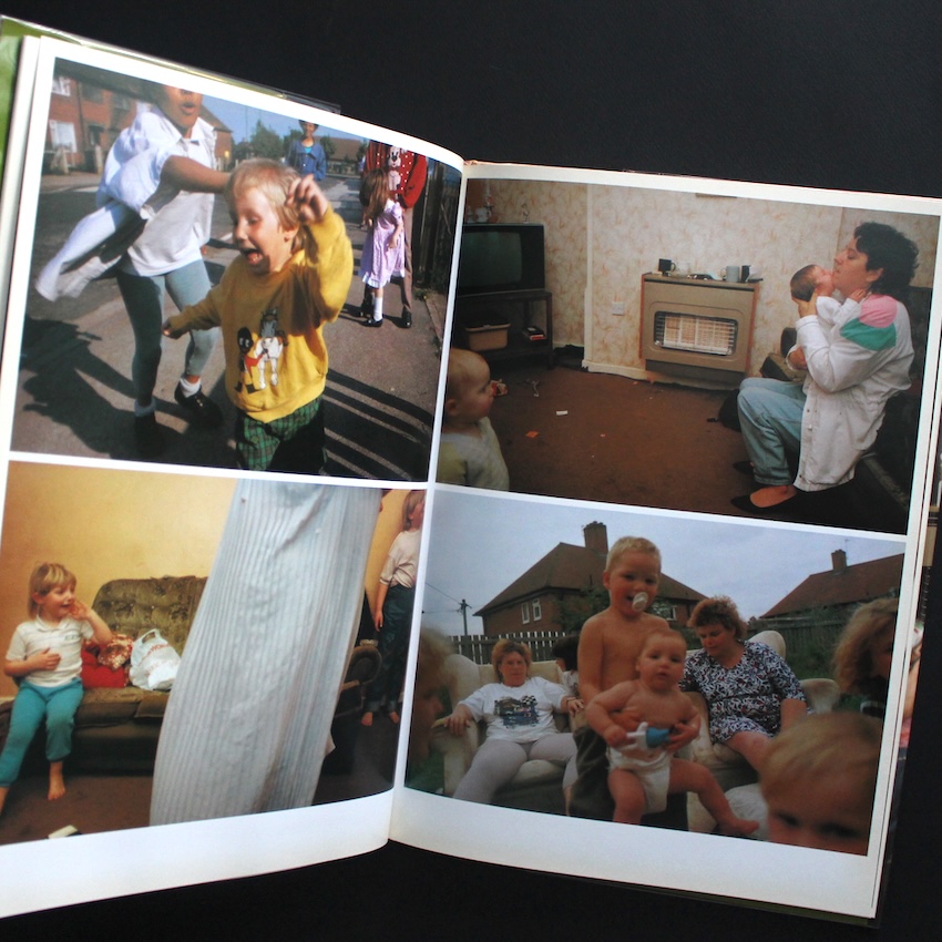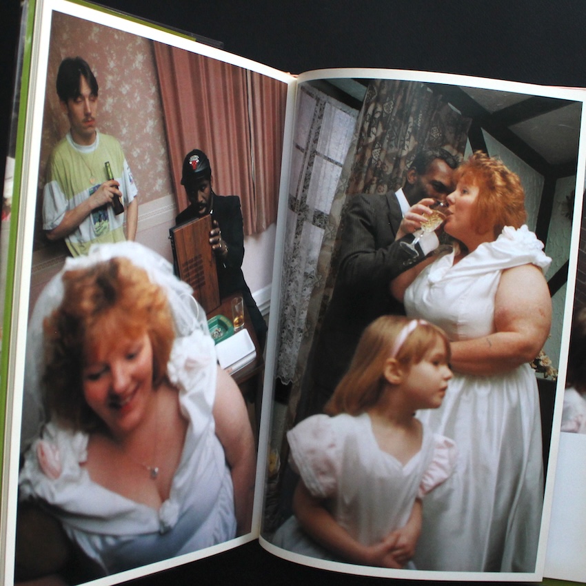 イギリスの写真家・ニック・ワプリントンの作品集『The Wedding: New Pictures from the Continuing "Living Room" Series』。1965年アデレード生まれのワプリントンは、労働者階級の家族や若者文化を独自の親密な距離感で捉えた作品群で知られ、1990年代の英国写真界を代表する存在です。ロンドンやノッティンガムを拠点に、ありふれた日常の奥にある感情やユーモアを鋭く、そして温かく映し出してきました。彼の作品は、社会的背景や階級意識といった主題を孕みつつも、決して断罪的にならず、あくまで生活のリアリティを描くことに徹しています。本書は、代表作『Living Room』の続編として1996年に刊行されたもので、同じコミュニティの中で行われたある結婚式を中心に構成されています。式の準備、家族の集合、宴の混沌――写真はすべてカラーで、陽気でざらついた空気をそのまま写し取っています。華やかさと混沌が交錯する場面の数々は、祝祭であると同時に、イギリスの庶民的な暮らしを浮き彫りにしています。キャプションを一切排し、写真だけで展開される構成により、見る者はまるで物語を覗き見るような感覚を味わいます。