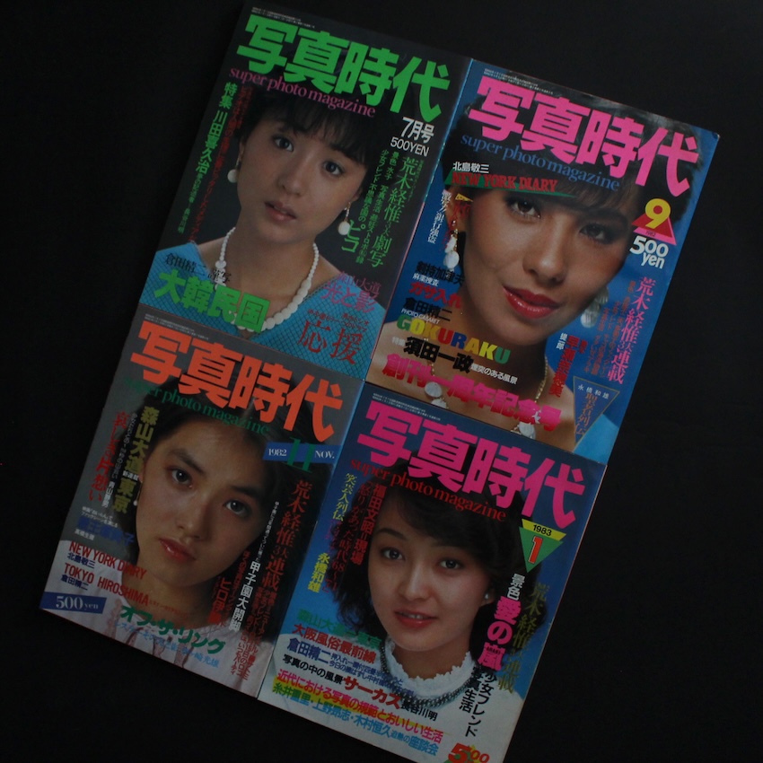エロスと芸術と写真が交錯するカオス的写真雑誌『写真時代』の1981年9月号創刊号から第9号までの9巻セット。エロスという入口でマスの読者層を掴み(表紙はいつもアイドルで本号は若かりし三原順子)、マニアックなエロスや本物のアート写真でニッチな読者層も取り込み、1980年代を席巻した写真雑誌です。メインキャラクターの荒木経惟、そして病み上がりから見事復活を遂げた森山大道は毎号連載で作品を発表、そしてその森山から教えを請うた倉田精二や北島敬三も登場します(ちなみに倉田のファーストブックで、写真史に名を刻む名著『Flash Up』は、写真時代編集長の末井昭によるブックデザインで、写真時代と同じく白夜書房からの刊行)。創刊当初は隔月の刊行となっており、貴重な創刊号や第3号などを含む、創刊から9号までのセット(9冊)での販売です。