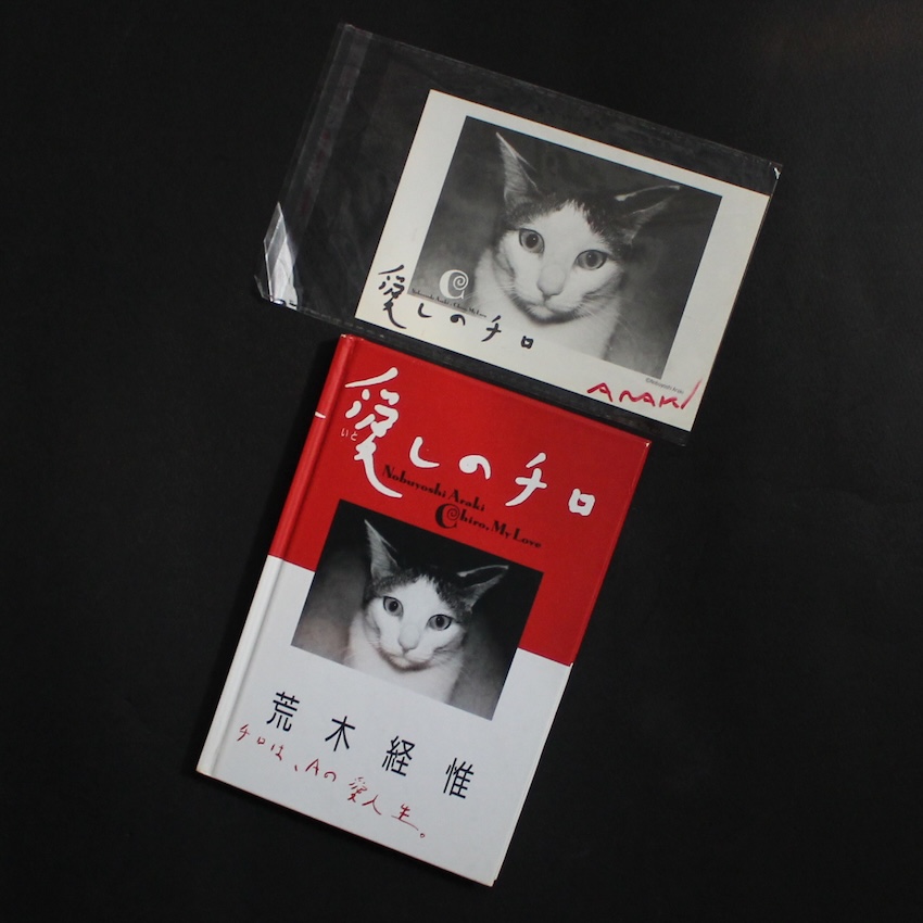 日本を代表する写真家・荒木経惟の写真集『愛しのチロ』。本書は、荒木とその妻・陽子の愛猫であったチロの写真集です。「愛人だし、人生だし」と荒木に言わしめるチロは、1988年3月に生後4ヶ月で荒木のもとにやってきますが、当初、荒木は猫嫌い。しかし、「Aはたちまちチロのトリコモナス」「ったくもー、可愛いったらありゃしない」とすっかり態度を改めています。バルコニーや近所の屋根の上、陽子の腕の中、眠る荒木の腹の上……自由きままに振る舞うチロの姿と、それを愛でるようにシャッターを切る荒木。随所にテキストも挿入されており、荒木のチロに対する想いがダイレクトに伝わってきます。その多くが1989年に撮影されたものですが、ちょうど陽子が子宮筋腫で入院し、不在となっていた時期もあり(そして1990年に亡くなる)、荒木のセンチメンタルな気分を投影する被写体として、チロの存在があったかのように思われます。陽子がこちらの刊行をとても楽しみにしていた為、棺の中の陽子の隣にも添えられた本書。初版・第1刷。写真家サイン及びメッセージ入り&サイン入りポストカード付属。
