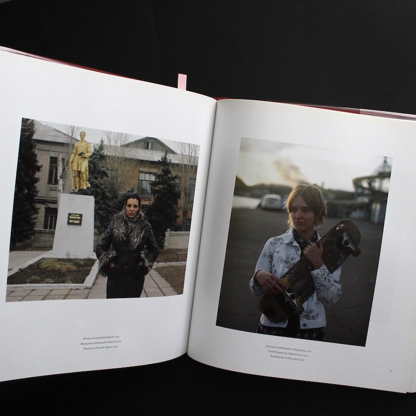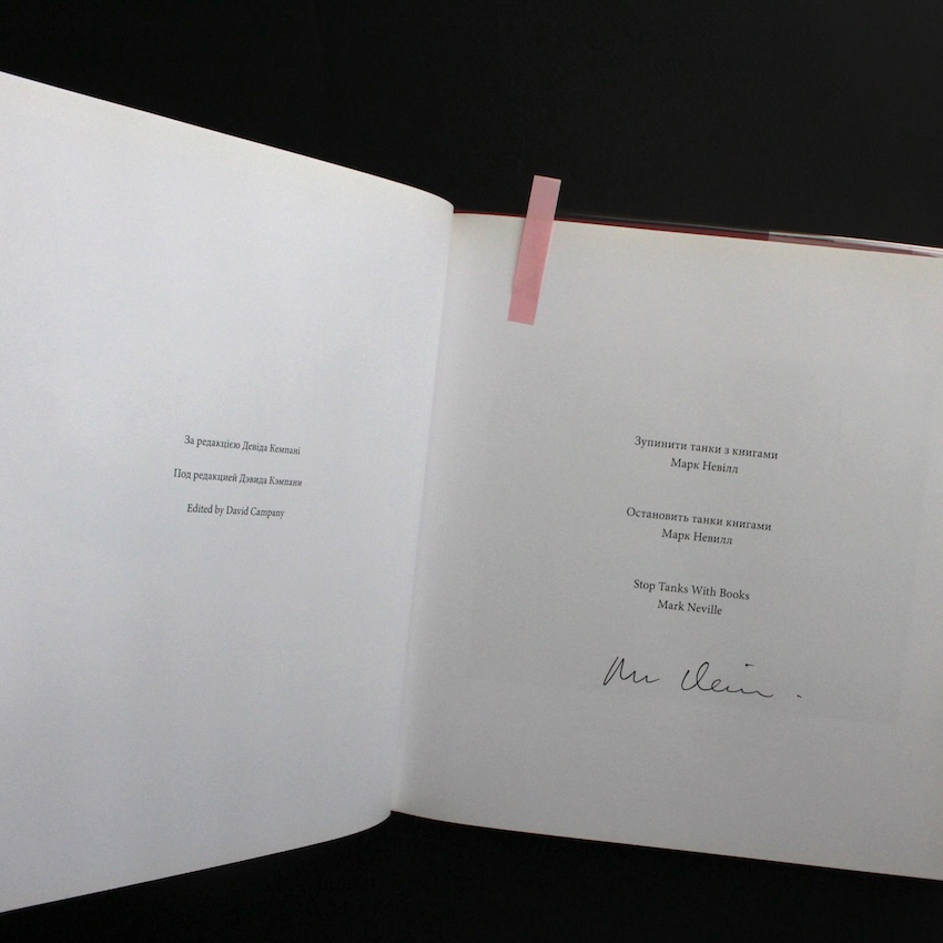 イギリスの写真家・マーク・ネヴィル(1966-)の作品集『Stop Tanks with Books(First Edition, Signed)』。ネヴィルはフォトジャーナリズムとアートの領域を横断し、写真を社会的・政治的な介入の道具として積極的に用いる活動で知られています。本書は、2016年に構想されたプロジェクトをもとに、写真集というメディアを「武器化」して世界の意思決定者に直接働きかけるという極めて異例の試みとして制作されました。ロシアのプロパガンダや差別的な偽情報に対抗し、ウクライナの人々をありのままに伝えるポートレートやリサーチ、Lyuba Yakimchukによる短編を3言語(ウクライナ語・英語・ロシア語)で収録。2021年末から2022年初頭にかけて、侵攻直前の緊迫した状況の中で急ピッチで製作され、外交官や政治家、NATO・EU関係者などに無料で配布されました。芸術作品であると同時に、国際社会への明確な「呼びかけ」として機能した本書は、写真が現実を変えるために使われ得ることを証明する、きわめて意義深い一冊です。尚、2版も刊行されていますが、こちらは初版本で、写真家サイン入り。