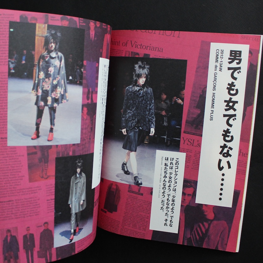 コム デ ギャルソンと川久保玲が生み出してきた服/デザイン/思想の全方位を、「1冊まるごとコム デ ギャルソン」として拡張・再編集した豪華保存版ムック。2012年に刊行され、1982年〜2012年のファッションストーリー、名フォトグラファーによる撮り下ろしビジュアル、コレクションの歴史・革新性・ブランド哲学を網羅しています。誌面構成では、「時代を揺るがしたコレクション10」「川久保玲独占インタビュー」「プロダクト・プロダクトデザインの道具的価値」「グラフィック&広告表現」「店舗空間デザイン」「メンズラインとブランドの多様性」など、多角的な切り口で魅力を探る章が立てられており、ブランドの生態系—服だけでなくグラフィック・ショップ・プロダクト・ファンコミュニティ—がひとつのまとまりとして伝わるようになっています。写真や装丁にも凝っており、蛇腹折・観音折といった開き方、ビジュアルページのボリューム感、赤いカバーなどビジュアル本としても持つ価値が高く、ファン/クリエイター双方にとって“見る喜び・探る楽しみ”が豊か。コム デ ギャルソンのアーカイブとしても、またブランドの創造性を考える資料としても重宝する一冊です。