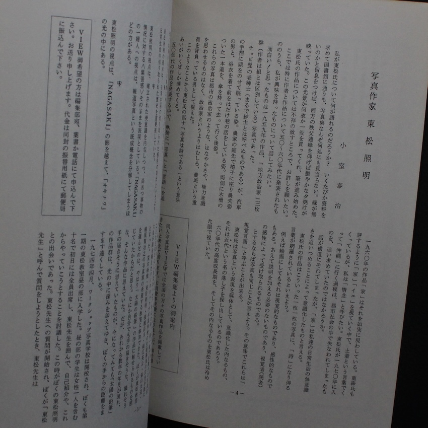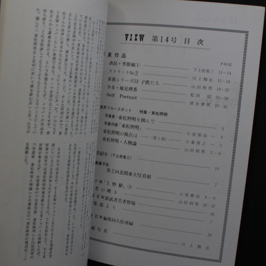 本書は、70年代後半に東松照明らの指導によって行われていた寺子屋式「ワークショップ・写真学校」の「東松照明教室」出身者である山田利男が中心となって77年5月に創刊された季刊写真誌『View』の第14号。山田は、地元の栃木県足利市にて、自身の写真店を使用したミニギャラリー「フォト・ショップ・アストリア」を立ち上げて意欲的に活動していましたが、北関東という限られたマーケットを広げるべく「ギャラリー」から「季刊誌」を通じた作品発表に取り組みました。地元の美術家や写真仲間らと協力して、数々の作品発表を行い、時には東京のギャラリー仲間「Camp」や「Put」などのメンバーの作品紹介も行い、81年6月まで全15号発刊しました。70年代頃からの「オフマガジン化」の流れで、写真家自らが「メディア」を立ち上げて、自由に意思や作品を発表していく動向の最たるもので、テキストも図版も大変興味深い内容となっています。