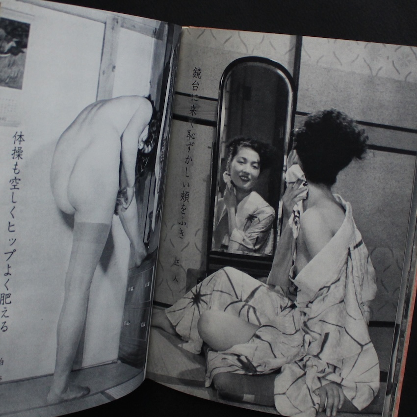 日本の作者による『風流写真川柳集』(新流社、昭和三十六年刊)。写真と川柳を組み合わせた一冊ながら、収録される写真は女性モデルに特化しており、当時のグラビア文化と軽文芸が交差する“昭和の風流”を体現した小出版物です。ヌードや半裸が含まれるものの、露骨な刺激ではなく、視線を誘う仕草や身体の曲線、化粧や装いの余韻といった「見立ての美」を重んじた構成が特徴で、昭和初期から続く艶笑文化の系譜に連なりつつ、下卑た印象を避けた静かな官能が漂います。添えられる川柳は、軽やかさで写真の世界を和らげたり、逆に僅かに含ませたりと、視覚と文芸が互いの余白を引き出す役割を担い、当時の大衆文化に特有のユーモアや情緒をそっと呼び起こします。女性像を一方的に消費するのではなく、季節感・しぐさ・間合いといった日本的な“風流”に寄せて表現することで、ヌード表現と川柳が品を保ちながら同居しており、写真文芸が持ち得た柔軟さと遊び心をよく示す一冊といえます。昭和三十年代の小出版社だからこそ生まれ得た、希少な文化の断片として今も独特の魅力を放っています。