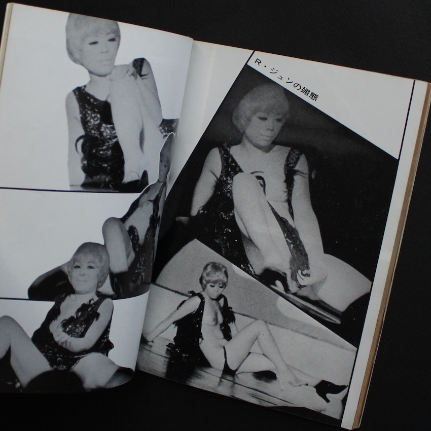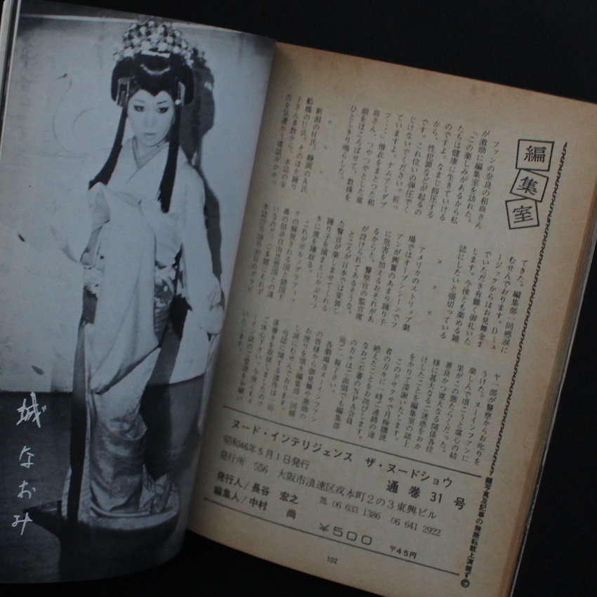 ストリップ専門誌として1966年(昭和41年)に中谷陽が創刊した『ヌード・インテリジェンス』の「31号 弾圧真相号」。 当初は実演レポートや劇場情報を扱う硬派なストリップ誌として出発し、ショー文化の成熟とともに誌面は独自のグラビア表現へと広がっていきました。1976年(昭和51年)に通巻50号を迎えると、表紙ロゴが“NU・IN”へ刷新され、誌面デザインもより視覚性を重視した構成へ移行します。写真のレイアウトやデザインが個性的で、モデルのポーズを大胆にトリミングした構図、カラーページの強い発色などが特徴となり、“昭和のストリップ”が持っていた様式美と即興性がそのまま紙面に刻まれています。読者投稿や短編小説を織り交ぜつつ、主要コンテンツはあくまでストリッパーの身体と舞台表現に焦点を当て、職業としてのストリップを日常的な文化として記述し続けた点でも特異な存在でした。1982年(昭和57年)に終刊しましたが、艶笑誌とも一般的な写真雑誌とも異なる“舞台文化の記録媒体”としての姿勢は他に類例が少なく、今日では雑誌史・風俗史双方から貴重な資料として評価されています。