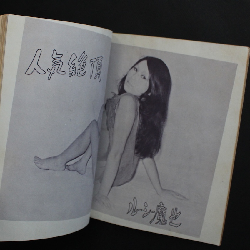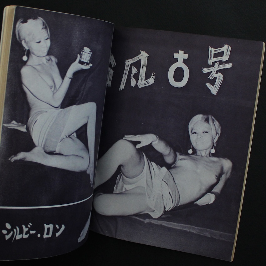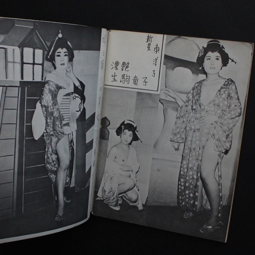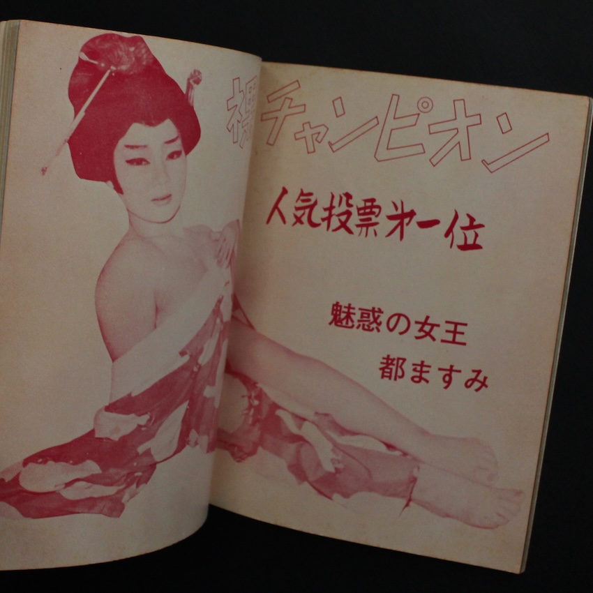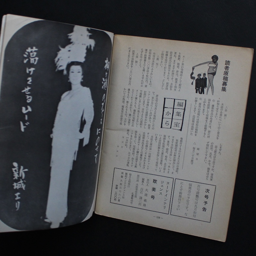 ストリップ専門誌として1966年(昭和41年)に中谷陽が創刊した『ヌード・インテリジェンス』の「5号 耽美号」。 当初は実演レポートや劇場情報を扱う硬派なストリップ誌として出発し、ショー文化の成熟とともに誌面は独自のグラビア表現へと広がっていきました。1976年(昭和51年)に通巻50号を迎えると、表紙ロゴが“NU・IN”へ刷新され、誌面デザインもより視覚性を重視した構成へ移行します。写真のレイアウトやデザインが個性的で、モデルのポーズを大胆にトリミングした構図、カラーページの強い発色などが特徴となり、“昭和のストリップ”が持っていた様式美と即興性がそのまま紙面に刻まれています。読者投稿や短編小説を織り交ぜつつ、主要コンテンツはあくまでストリッパーの身体と舞台表現に焦点を当て、職業としてのストリップを日常的な文化として記述し続けた点でも特異な存在でした。1982年(昭和57年)に終刊しましたが、艶笑誌とも一般的な写真雑誌とも異なる“舞台文化の記録媒体”としての姿勢は他に類例が少なく、今日では雑誌史・風俗史双方から貴重な資料として評価されています。
