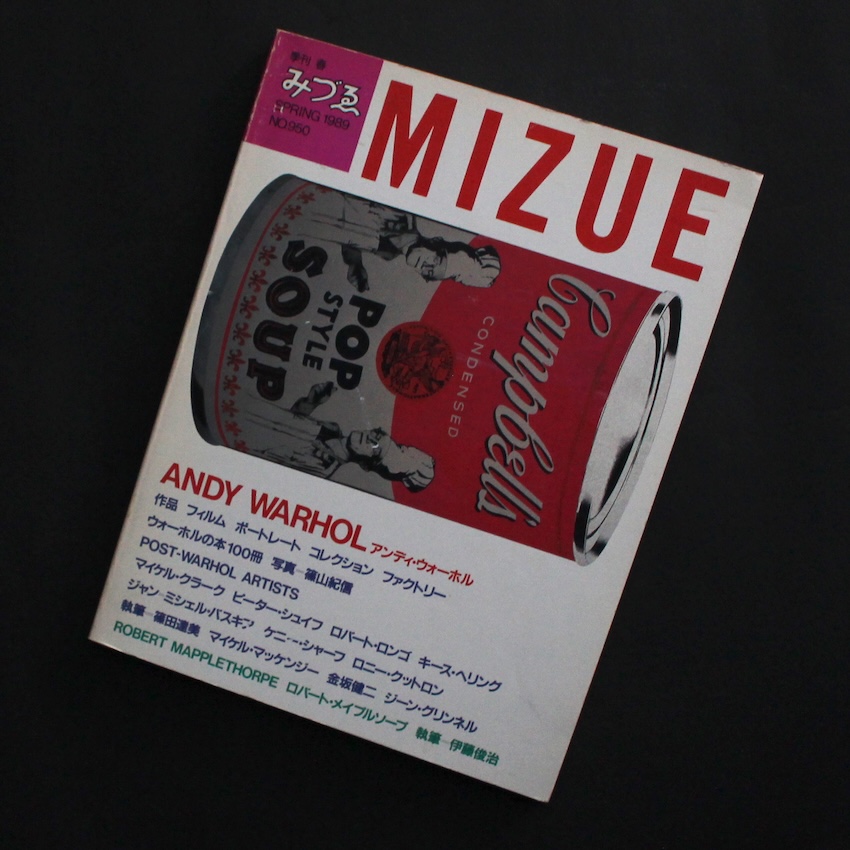 1989年刊行の『季刊みづゑ SPRING No.950』は、アンディ・ウォーホルを中心に据えた特集号で、作品図版と複数の論考・インタビューから構成されています。巻頭では《Andy Warhol 1928–1987》として代表作の図版が紹介され、その後、三木多聞による「ウォーホルにとってのサムタイムズ」や、北中正和による「シネマとポップの交点」、吉村和昭による「不在のスペース――ウォーホルの映像」、マイケル・マッケンジーによる論考、さらにロニー・カトローの「Be Me or Your Philosophy/9つのAまたはBe-Back-Again」など、多角的な視点からウォーホルの表現を扱った寄稿が続きます。また、篠山紀信による「ウォーホルの本100冊」、マイケル・マッケンジーによる「Famous Works of Warhol」、ジーン・シンネルによる「The World of the Factory/工場という世界」など、作品の紹介から資料的整理まで幅広く収録されています。最後にはロバート・メイプルソープを取り上げた短いセクションも含まれ、図版・批評・資料が組み合わされた編集となっています。目次に示された内容に基づき、ウォーホルの多面的な活動を網羅的に扱う特集号です。
