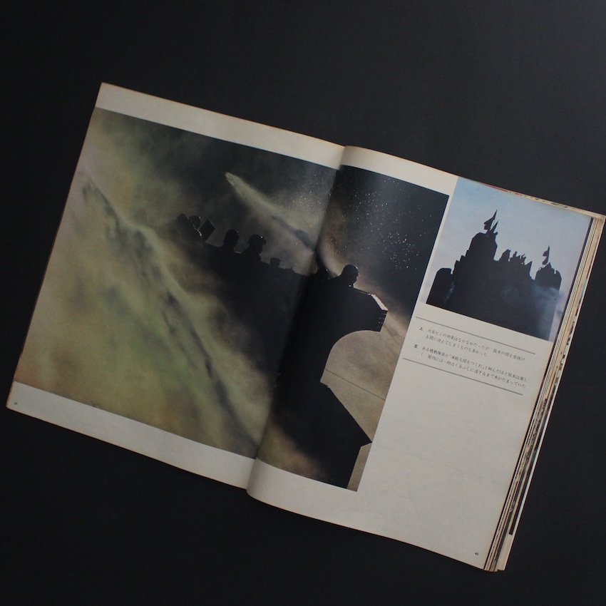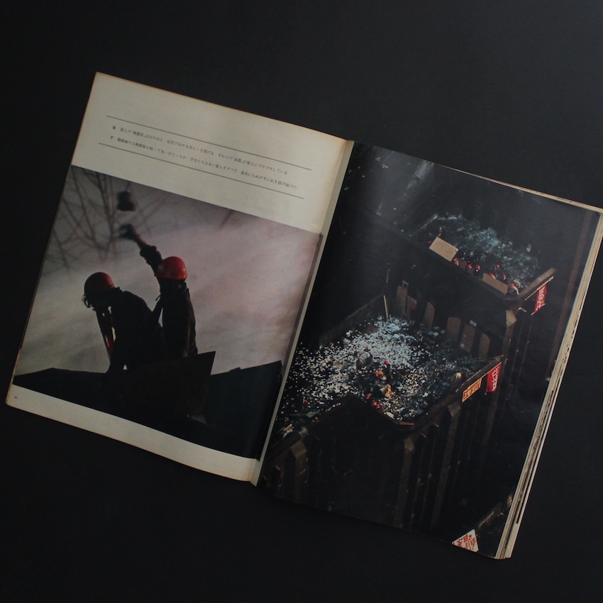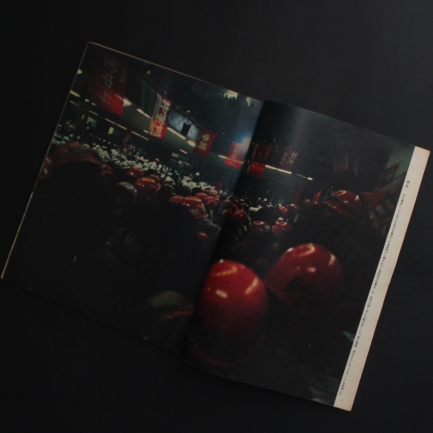 本誌は、朝日新聞社 によって1923年1月25日に創刊された日本初期の週刊グラフ誌『アサヒグラフ』の『アサヒグラフ 1969年2月7日号 特集・拡大する「学生反乱」』。2000年10月13日号をもって通常刊行を終了するまで、約77年にわたり刊行された古参誌。特徴は、紙面のかなりの割合を写真やイラストが占める「見る新聞/報道のビジュアル化」。文章と写真を併用し、事件、風俗、文化、世相、戦争、戦後復興、高度経済成長、バブル――といった近代〜現代日本の激動の変化を視覚的に記録し続け、芸術や報道、社会の記録としての役割を果たし、多くの読者に「現場を“見る”」感覚を与えました。本号は、1960年代の半ば以降、全国の大学で勃発した「学生反乱」の様子をモノクロ・カラー交えて紹介された貴重な一冊で、通常の号以上に写真図版が充実しています。