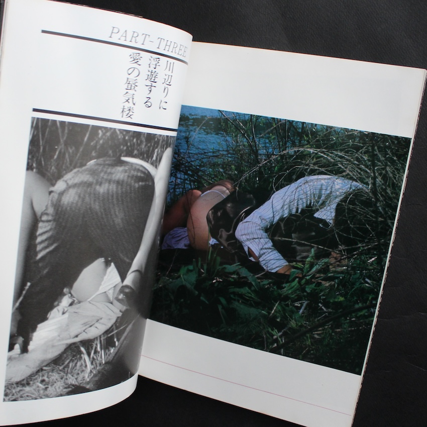 本書は、1980年前後に蒼竜社より刊行されていた雑誌『クールガイ / Cool Guy』の増刊として刊行された『ピーピングラブ / Peeping Love クールガイ増刊』。戦後日本を代表する写真家のひとりで「赤外写真」で名を馳せた吉行耕平。代表作『ドキュメント 公園 / Document Park』は、2007年に海外で改訂版が刊行され、2019年にも版を新たに復刻版が発表され、高い人気を誇っています。また、密写師と呼ばれ、雑誌『写真時代』でも末井昭に取り上げられていた篝一光の『ドキュメント 通勤電車 / Document Commuter Train』なども人気がありますが、時代的にもこのような類の写真が多く扱われていたようです。本書も、その類の一冊で、モノクロ・カラーのイメージが連なります。(地にゾッキ線あり)