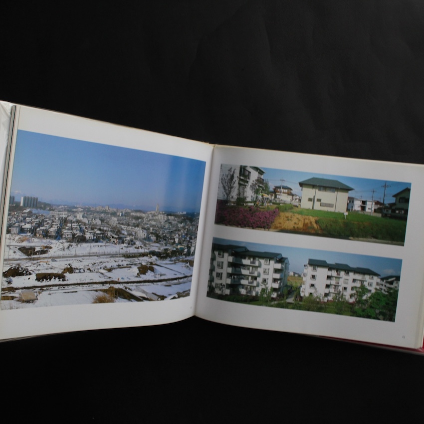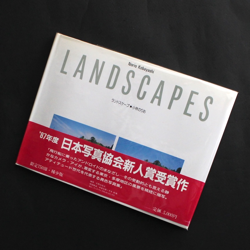 日本の写真家・小林のりおの写真集『ランドスケープ / Landscapes(With OBI)』。アメリカの写真家ロバート・アダムズやルイス・ボルツらに代表される「ニュー・トポグラフィクス」の第一人者とも言われる小林のりお。1993年刊行の「ファースト ライト / First Light」で第18回木村伊兵衛賞を受賞、本書は私家版で刊行された1st作品集で、日本写真協会賞新人賞受賞作品。東京の郊外・多摩ニュータウンの変貌を捉えた風景写真で構成されています。一見変哲のないカタログ写真のようなカラー図版の中に、郊外の移り行く歴史が刻まれています。トタンや茅葺きで出来た古い家屋は取り壊され、森林は崩壊し、赤土はむき出しで「砂漠化」した丘陵は、やがて人間の手と機械により、団地・マンション・一戸建てが建ち、自然と人工物が入り混じった光景へと変貌します。その無機質な風景の中に「歴史」と、不思議な「奇妙さ」が宿る、「客観的」ながら異常な「主観的」要素も感じさせる写真の奥深さが絶妙に表現された稀有な一冊。小冊子付き。750部限定。帯付。