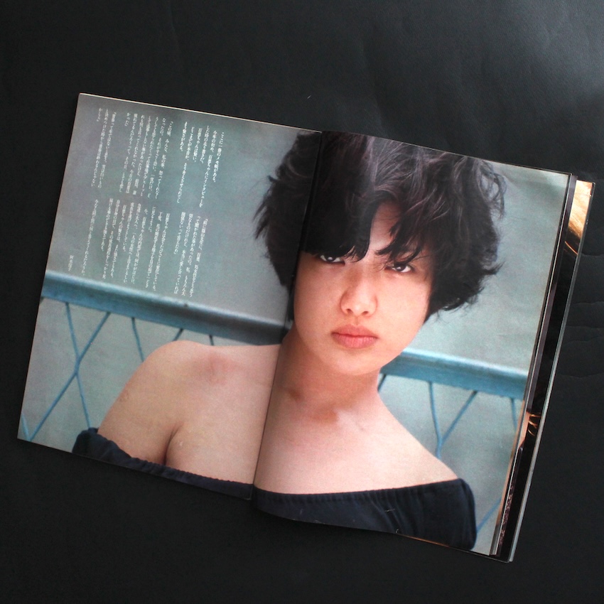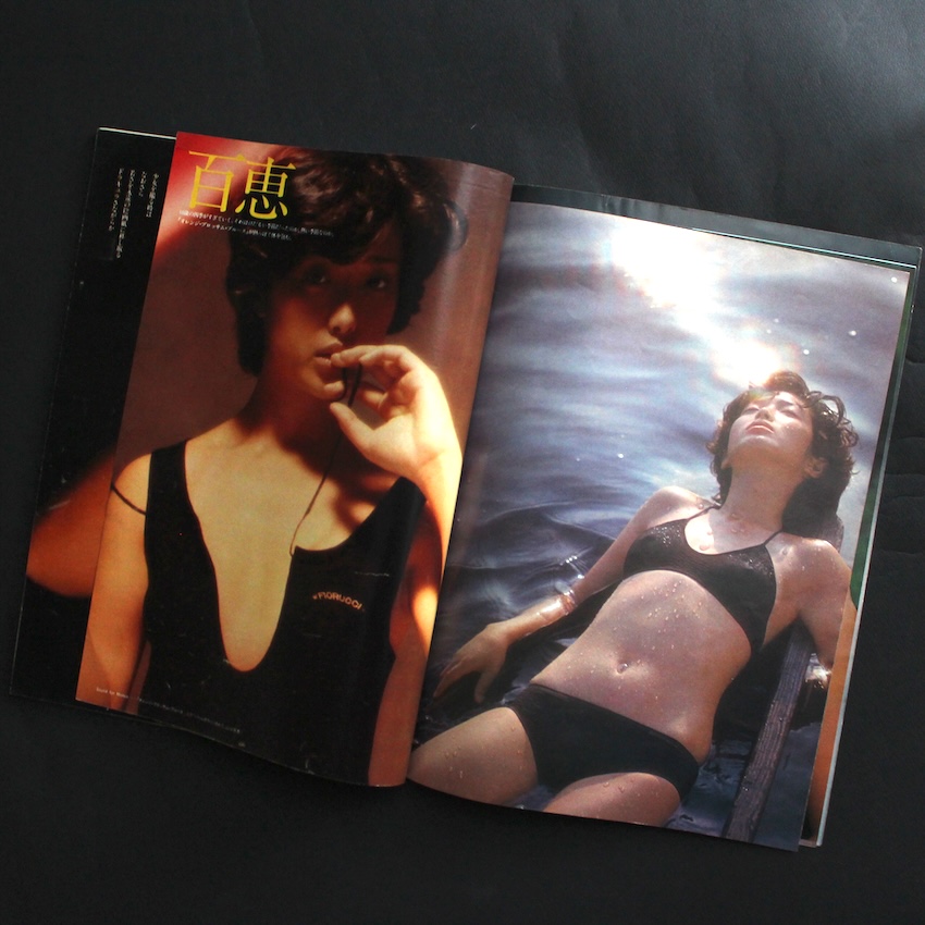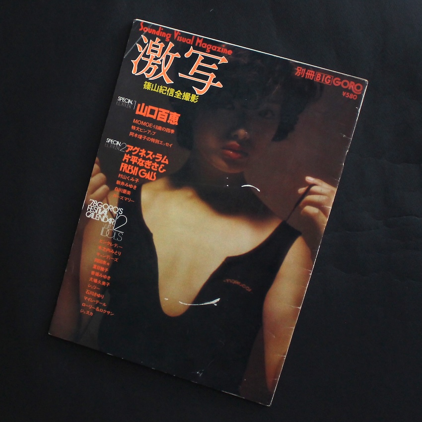 小学館『別冊BIG GORO』として1970年代に展開された「激写」シリーズの1977年11月号。「激写」は、当時の若者文化やスターを、即時性と身体感覚を重視した写真で捉えたフォトマガジン群です。スタジオ的な作り込みや完成度よりも、現場でのスピード、被写体との距離の近さ、状況そのものを写し取る姿勢が特徴で、ロックミュージシャン、俳優、アイドルといった存在を、消費されるイメージとしてではなく、同時代の熱量を帯びた「出来事」として定着させてきました。誌面構成もB4判の大きなサイズやピンナップを含み、雑誌と写真集の中間的な性格を持っています。「激写」は単なるシリーズ名ではなく、70年代日本におけるメディアとカルチャーの接点を象徴するフォーマットであり、本号では、山口百恵の特集のほか、片平なぎさ、アグネス・ラムなどが登場します。