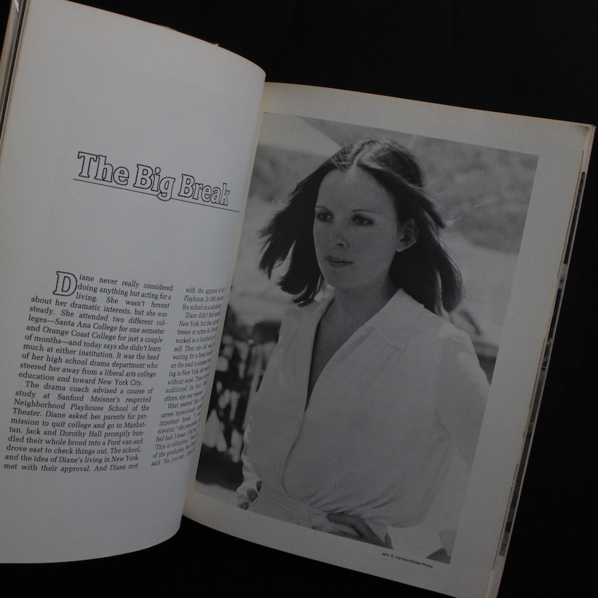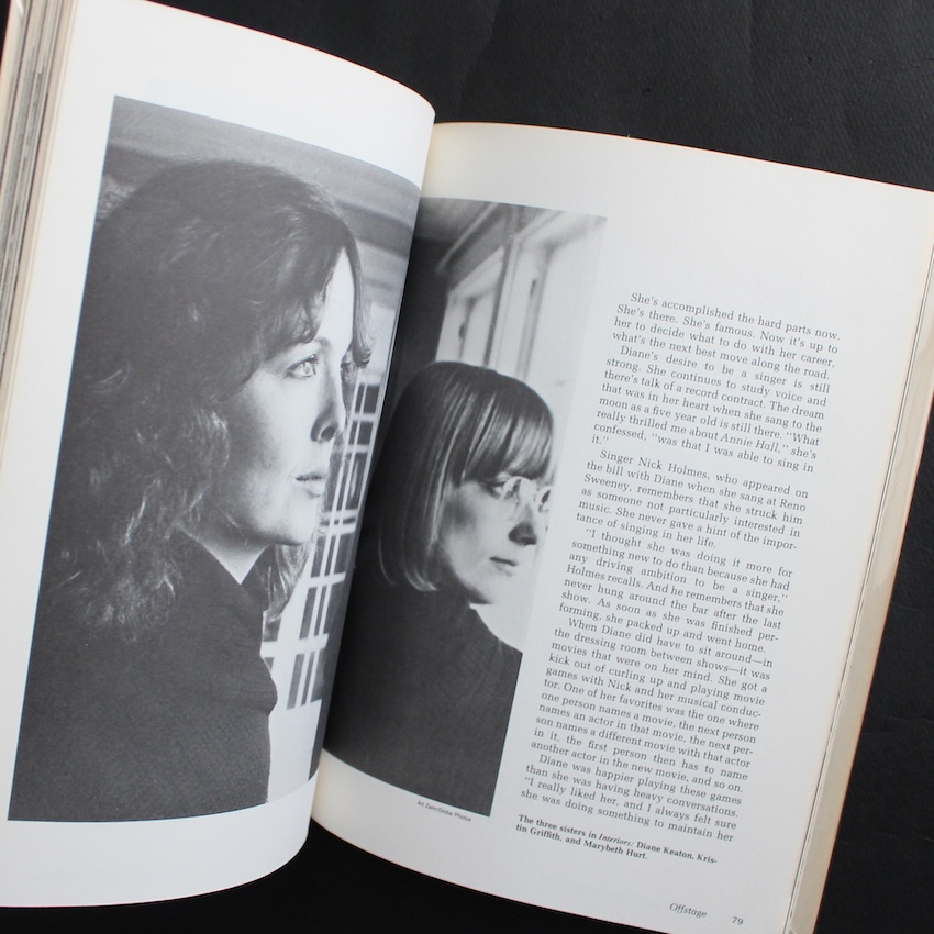 アメリカの映画女優ダイアン・キートン(1946–)を紹介したビジュアルブック『The Diane Keaton Scrapbook』。キートンはフランシス・フォード・コッポラ監督の『ゴッドファーザー』シリーズで広く知られ、ウディ・アレン監督の『アニー・ホール』(1977)ではアカデミー主演女優賞を受賞するなど、1970年代ニュー・ハリウッドを象徴する女優の一人として人気を集めました。本書は1979年に刊行されたスクラップブック形式の一冊で、映画スチール写真やプレスフォト、雑誌記事、フィルモグラフィーなどをコラージュ的に構成し、当時のスターとしての姿を多面的に紹介しています。1970年代に多く出版されたセレブリティ・ブックの一例として、当時のハリウッド映画文化やスター文化の空気を伝える資料としても興味深い内容となっています。