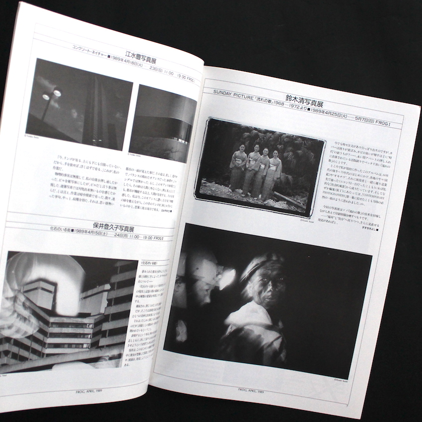 こちらは1990年代初頭より四谷にあった写真ギャラリー「Frog(Film Round Gallery)」より刊行されていた写真情報誌で、1989年1月から1991年10月号を最後に月刊号として計34号まで発刊されました。その後「Frog」は、情報誌はやめて写真展の企画・運営や、写真集の刊行等をメインに「mole」として活動が続けられ、1990年代の自主ギャラリーの中心的存在でした。ちなみに「Frog」の前身は「ルナハウス」と呼ばれるフリースペースで、そこではYCM(四谷コンテポラリーミュージアム)という写真家メンバー数名によって営まれていたグループが、様々な企画展を催していました。「Frog Letter / Frog Gazette」は、当ギャラリーで行われる写真展の紹介の他、写真家や評論家などによるエッセイや論文なども収録されており、第1号の島尾伸三から始まり、鈴木志郎康、伊藤俊治、大辻清司などが執筆を担った他、金子隆一や飯沢耕太郎らも定期的に連載を行い、金子は写真集の名著の解説などを行なっていました。「読み物」的要素が強いものですが、90年代の「コンテンポラリー」な写真家たちの取り組みや動向を知るには大変貴重な情報誌になります。