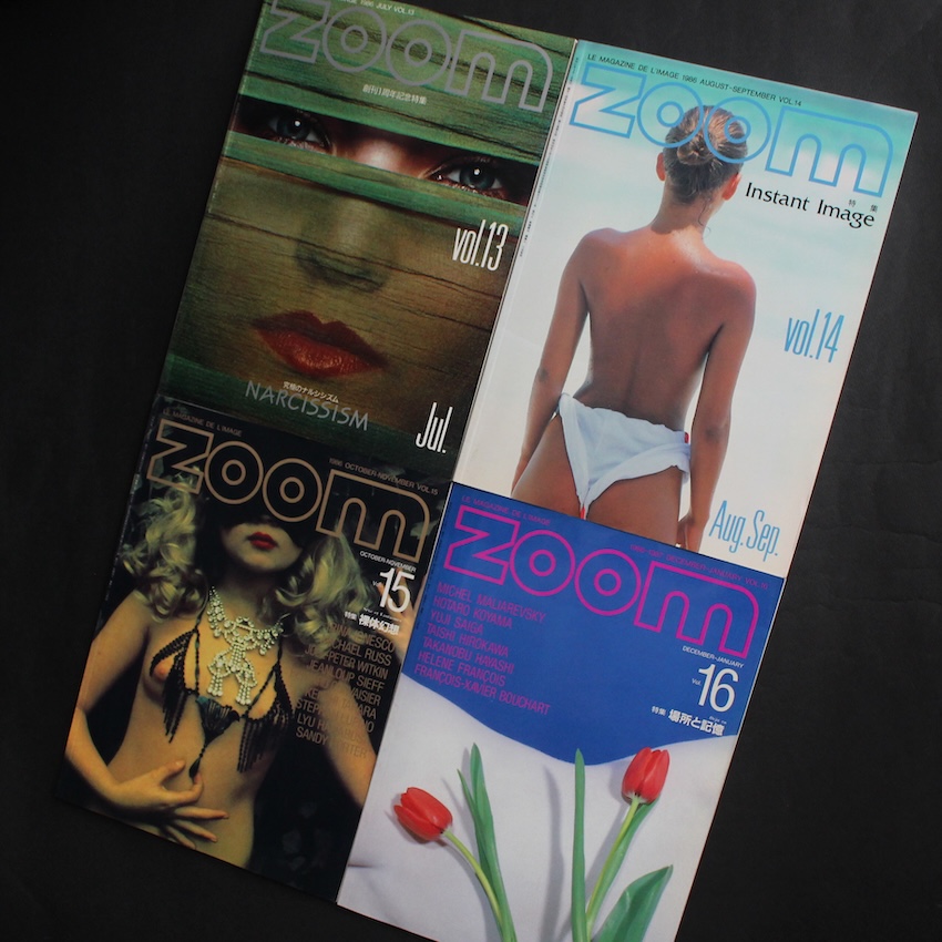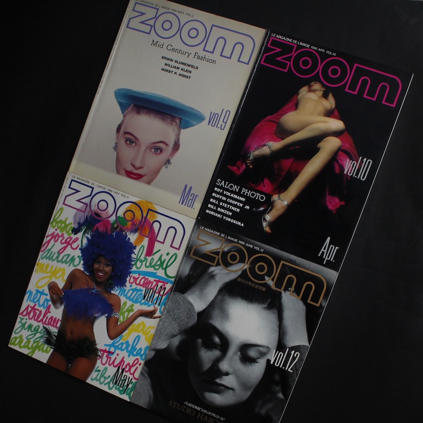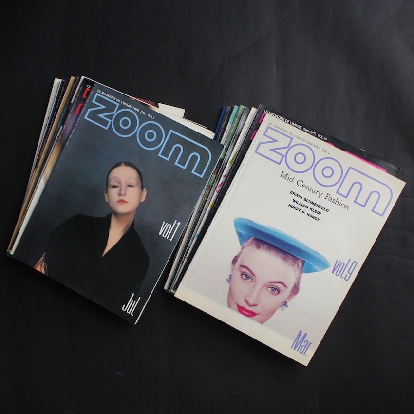 フランスで創刊された写真・ヴィジュアルカルチャー誌『Zoom』の思想を受け継ぐ日本版『Zoom』の1〜16号セット(完号不明)。Zoomは写真雑誌から写真集文化へ移行していく流れを考える上で重要な存在です。フランス版『Zoom』は、Helmut NewtonやGuy Bourdin、William Kleinらを取り上げ、アート、モード、映画、広告を横断しながら、写真を単なる記録ではなく編集されたイメージ空間として提示しました。大判で印刷品質の高い誌面や、写真家単独特集を軸にした構成は、雑誌でありながら一冊の写真集のような保存性を備えていました。日本版『Zoom』もこの編集思想を引き継ぎつつ、日本独自の視点で海外作家と日本の写真表現を接続し、従来のカメラ技術誌ともグラフ誌とも異なる位置を築きます。機材や技法を中心にした「カメラ雑誌」の文脈から、イメージそのものを読む媒体への転換点として、『Zoom』は後の写真集的編集を先取りした存在といえます。その意味で、戦後の写真雑誌文化を担った『カメラ毎日』『アサヒカメラ』らの先に『Zoom』があり、その延長線上に90年代の『Déjà-vu』がある、という系譜で見ることもできるでしょう。雑誌でありながら「読むもの」である以上に「見るもの」として構想された『Zoom』は、写真集文化へ向かう橋渡しを担った媒体として再評価できる存在です。