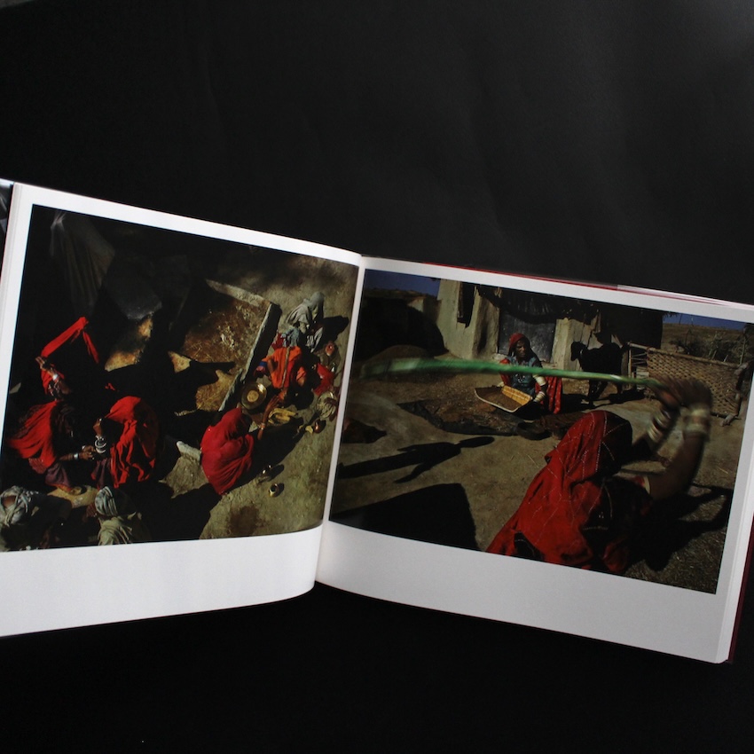 ベルギーの写真家ハリー・グリエール(1941-)の作品集『India』。マグナム・フォト所属のカラー写真の先駆者として知られ、光と色彩の対話を探求しながら、旅先で見つけた日常の風景を詩情豊かに写しとってきたグリエール。本作では、インド各地の街路や市場、宗教儀礼、交通の混沌などを独自の距離感で捉え、強烈な色彩と複雑に交錯する光が、土地のリズムや人々の息づかいを視覚的に響かせています。視線が交わることなくカメラだけがそっと滞在しているような構図が多く、観察者としての立場を保ちながら、雑踏のエネルギーをそのまま写真に落とし込んでいる点が特徴です。赤やオレンジ、青など鮮やかな色面が画面を支配する一方、影の濃度が強いコントラストを生み、祈りや沈黙といった内面の時間も感じさせます。異文化への憧れや異邦人としての戸惑いを抱きながらも、彼の写真はステレオタイプをなぞらず、眼前にある光景に丁寧に寄り添うように撮影されており、土地の多層的な魅力を静かに伝える一冊です。