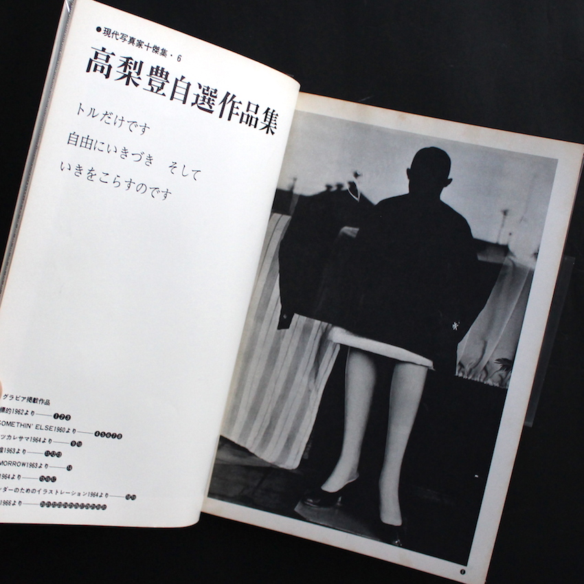 本書は、写真同人社が発行していた写真雑誌『カメラ時代 1966年6月号』で、メインは「高梨豊自選作品集」。写真同人社と言えば、東松照明のファースト・ブック『〈11時02分〉 Nagasaki』の刊行で知られていますが、その後すぐに会社が傾いてしまい、東松は残った在庫を自ら設立した出版社で販売した経緯もありました。この時期のカメラ時代は高梨以外にも、細江英公、川田喜久治、横須賀功光、長野重一、富山治夫らも同じように自選作品の特集が組まれていました。本号では、「標的1962」「Somethin'Else1960」「オツカレサマ1964」「路線1963」「Tomorrow1963」「休日1964」「カレンダーのためのイラストレーション1964」「東京人1964」が収録されており、その他高梨の師にあたる大辻清司によるテキスト「高梨豊論」なども興味深い内容です。ちなみに、本書のカバー図版も高梨の作品であり、題字・デザインは、高梨の代表作『都市へ』(1974)の装幀も手がけた杉浦康平と田中一光。(奥付蔵印あり)