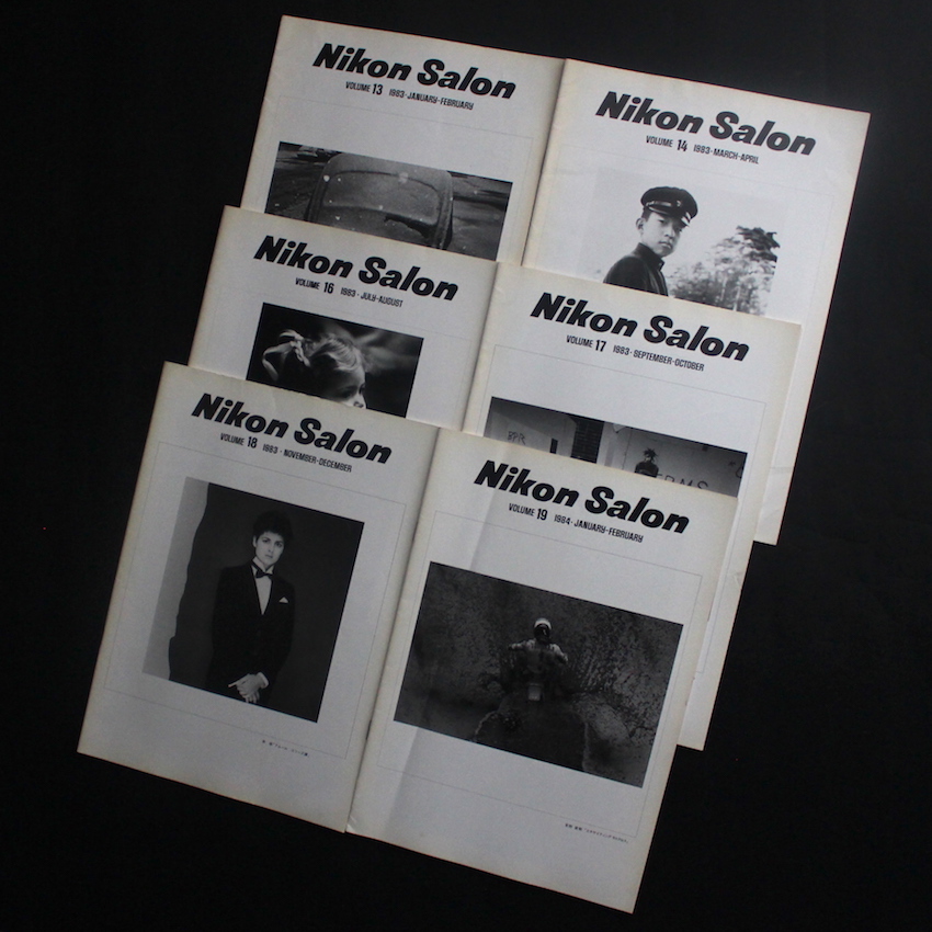 深瀬昌久の「烏」など、これまでに数々のエキシビジョンを開催してきた「ニコンサロン」。こちらは1980年代から90年代にかけて、写真家・作品・展示スケジュール等の案内のために、隔月で刊行されていたカタログ。主な収録写真家及び作品は、小見重義「地炉とかねっこり」・福田文昭「怒りがあった時代'68-'71」・石井雄司「未練色の記憶」・中川秀典「'82親父が逝った和歌山私景」(Vol.13)、林隆喜「アフターマス(余波)」・毛利壽夫「アメリカン・ハイスクール・ライフ」・有野永霧「虚実空間・都市 ロンドン編」(Vol.14)、秋山忠右&佐藤晴雄「區」・小林洋治「50年代最後のパリ」(Vol.16)、桑原史成「非武装地帯の南」・有野永霧「虚実空間・都市 ニューヨーク編」、深瀬昌久「歩く眼(一)街・川筋、(二)松原団地」(Vol.17)、瀬戸正人「バンコク、1983」・浜田ツマ「川の音」(Vol.18)など。