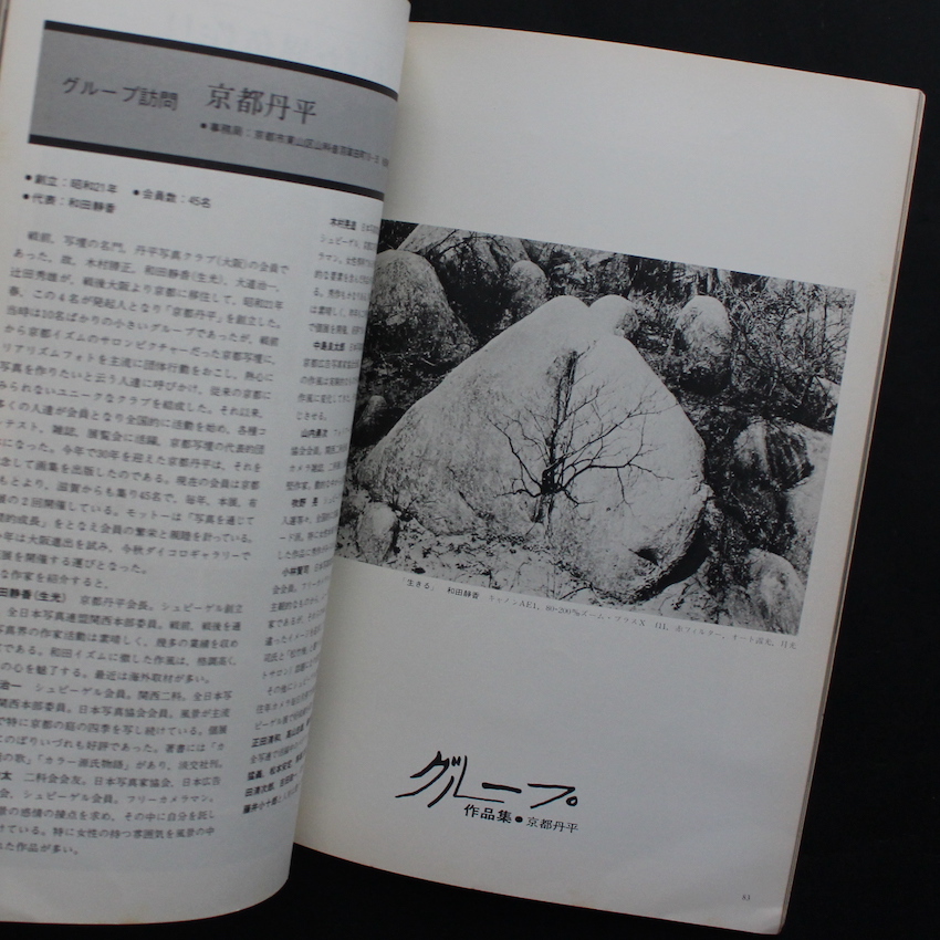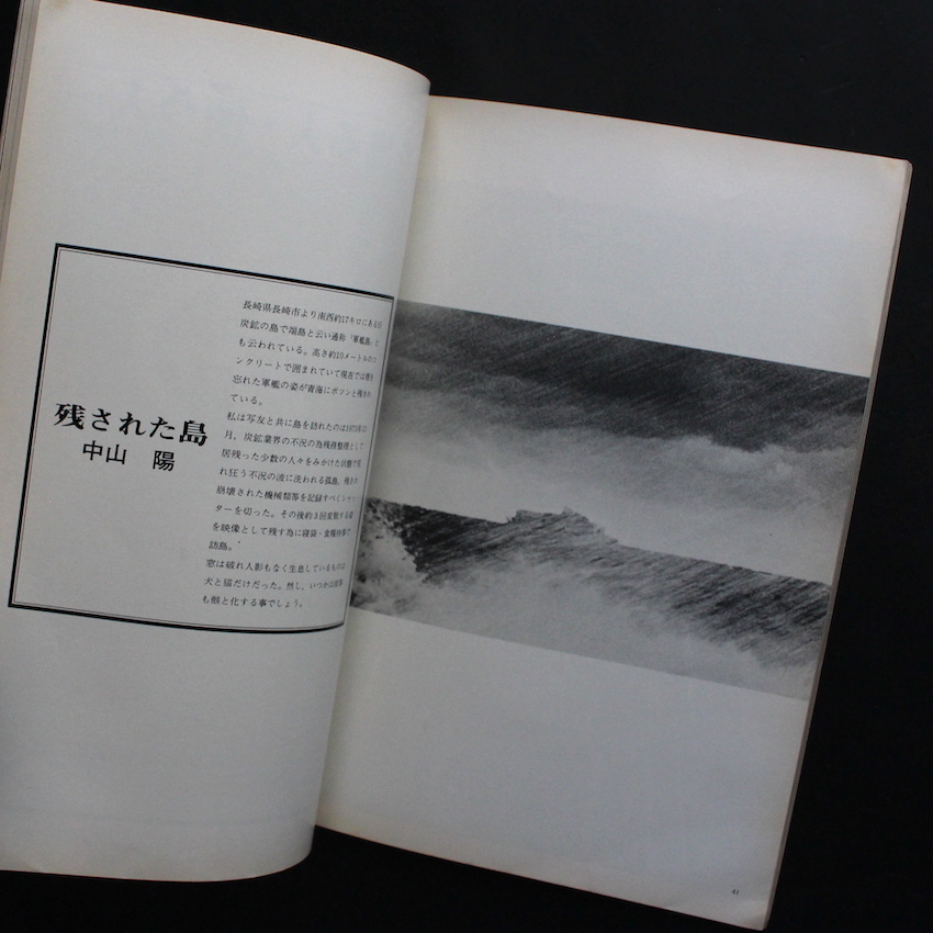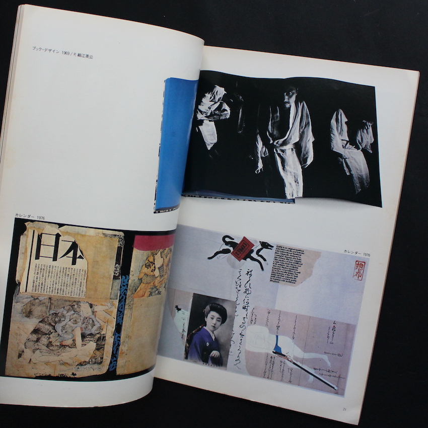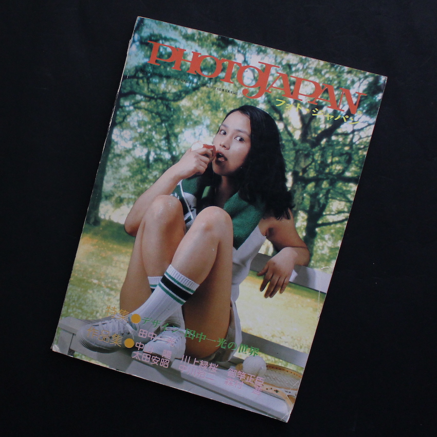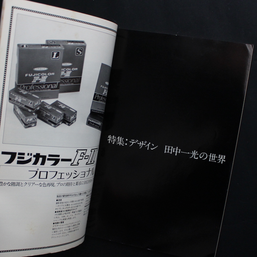 本書は、日本商業写真家協会が発刊していた写真誌『フォトジャパン / Photo Japan No.9 1977 Autumn』。写真雑誌でありながら、本号のメイン特集は「デザイン 田中一光の世界」。西武、パルコ、流行通信でのコマーシャルワークから、土門拳、細江英公、篠山紀信らの作品集のエディトリアル、さらにはカラーのグラフィック・アートなども収録されています。その他、作品集『断層 -筑豊、この滅びざるもの-』などで知られる中山陽(あきら)による「軍艦島」、京都丹平によるグループ作品集など、モノクロのイメージも大変充実しており、見応えのある図版が多数紹介されています。