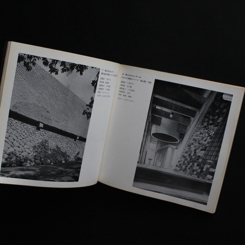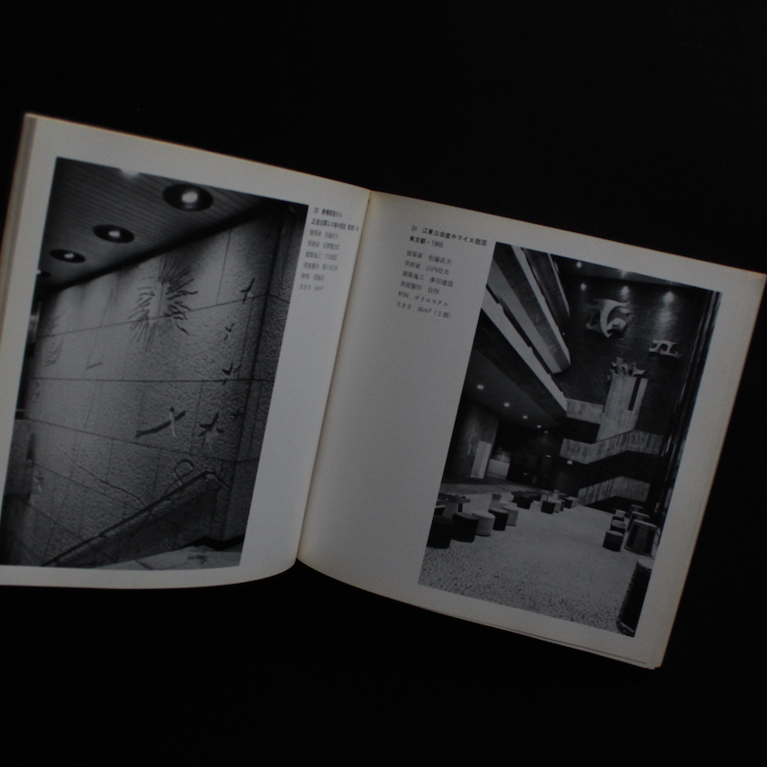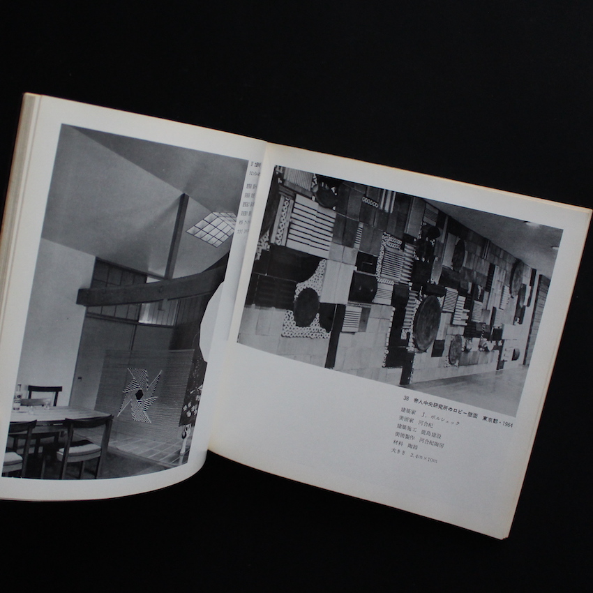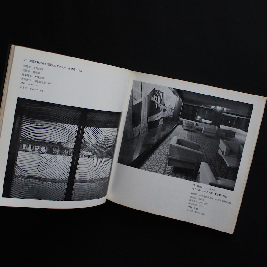 本書は、1968年に東京・晴海の日本建築センターで行われたエキシビジョン『建築+美術 作品写真展』を機に刊行されたカタログ作品集です。建築と美術の関わり方・シナジーについて問い正すべく行われた展示であり、建築が及ぼす空間形成に美術を織り交ぜることで、環境芸術の質の向上に大きく関係するという60年代からの世界的な流れも汲んで行われました。谷口吉郎、村野藤吾、吉村順三、前川國男さらにはアントニン・レーモンドといったこの時代を代表する建築家と、朝倉摂、篠田桃紅、佐野繁次郎、岡本太郎、亀倉雄策といった美術家やデザイナーとのコラボレーションが、写真集のような体裁で楽しめる一冊です。