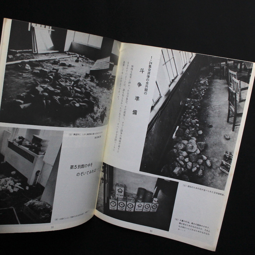 本書は、1969年に関学革新評議会より刊行された写真集『苦悩!関学紛争の報告』。1967年に学費の値上げに端を発した関西学院大での闘争は、69年初頭には激化し、3月23日の決起集会では、全共斗の投石によって左眼の失明者まで出るという事態に。そんな仲間たちの救済資金のため、またこの実情を訴えるべく刊行された50ページ強の小さな冊子です。関学闘争関連の写真集といえば、同年に全学共闘会議出版局より刊行されている『Non : 関学闘争の記録 / Non : Record of the Kansei Gakuin Struggle』が有名で、内容・編集・構成いずれも優れた内容になっており、本書は、より安価な冊子タイプのものではありますが、「写真集」とうたっている通り、収録図版も大変充実しており、Protest関連の写真ファンには一読いただきたい一冊です。