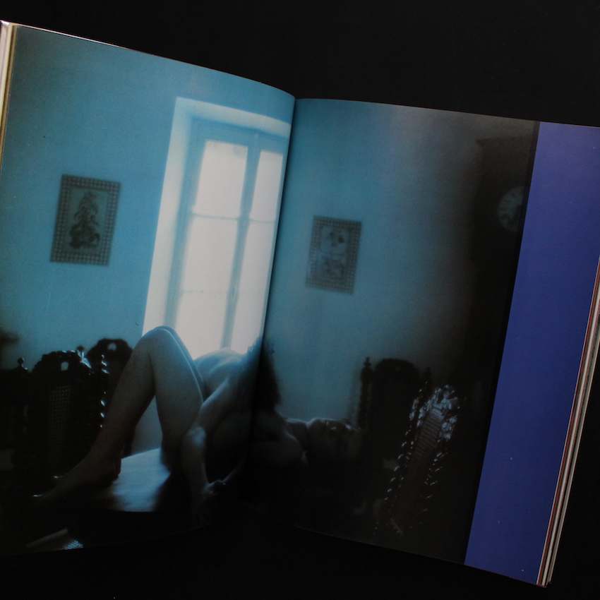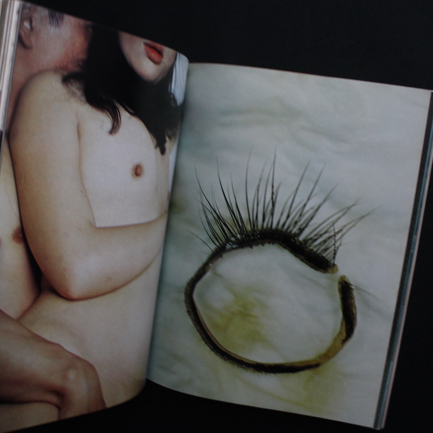 日本の写真家三名による写真集『女と男』。その巻頭で、発行者の原善三郎は、江戸時代の浮世絵春画を世界に誇るべき文化と述べ、「江戸時代の絢爛に対抗しうる絢爛」として「浮世絵の風格を各作家の個性に合わせて表現すること」を本書で試みようとしています。こうした原の要望を受けた三者は、男女の性愛をそれぞれのスタイルで表現。立木は、自身の写真を「春画風夢心地写真」と述べていますが、自然光が優しく照らし、ソフトフォーカスで写し出された男女は、甘美でドリーミーな雰囲気に満ちています。加納は『FUCK』で発表した作品を交え、原が「持前のダイナミズム、重層化されたイメージで極彩色をもって厳粛な気配を示した」と評しているように、クローズアップされた身体や観音開きによるページ展開、また独特の色調と温度感が艶かしい。一村は、男女の交わりの間に様々なイメージを挿入することで、2人の快楽を別の視点で喚起するような構成を取り、三者三様の“春画”が見て取れます。帯欠。