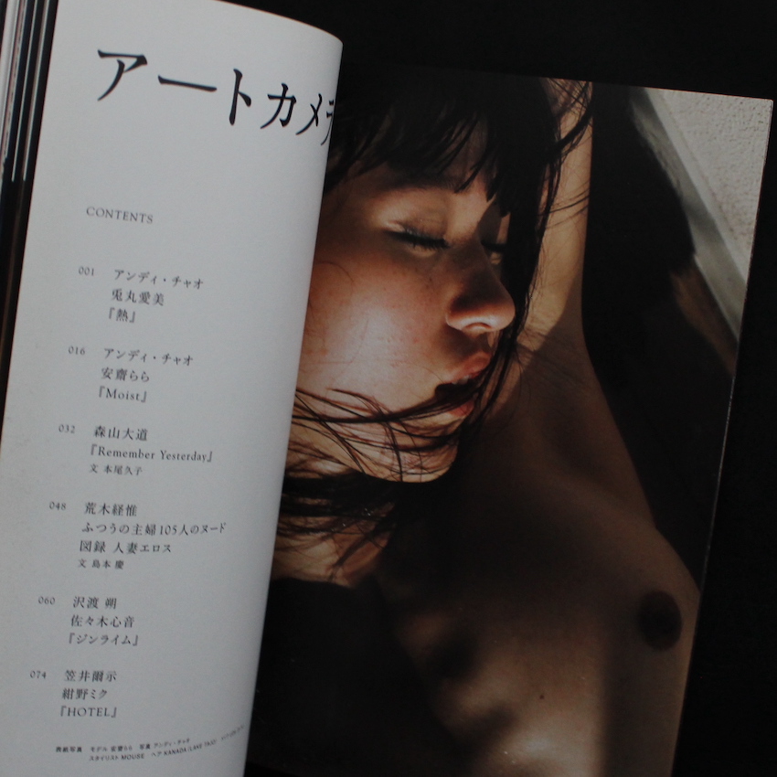 本書は、雑誌『週刊大衆』編集部によって刊行された『アートカメラ 2014 現代写真作家フォト選集 Vol.1』。荒木経惟・森山大道・沢渡朔・笠井爾示、及びアンディ・チャオの5名の写真家のヌード作品にフォーカスしてまとめられた一冊。荒木=週刊大衆、と言えば、2000年代から週刊大衆内で連載を続けてきた「人妻」シリーズで、本誌が刊行されるまでに750名にも及ぶ一般募集の人妻をカメラに収めてきたという荒木ですが、本書ではその一部を紹介。森山のヌード作品は大変少ないですが、70年代に半年ほど雑誌『プレイボーイ』に連載していたアーカイブから一部を紹介。その他、沢渡は佐々木心音、笠井は紺野ミク、アンディは安齋ららと兎丸愛美とコラボしています。編集は本尾久子、ARTイワタメンバーら。