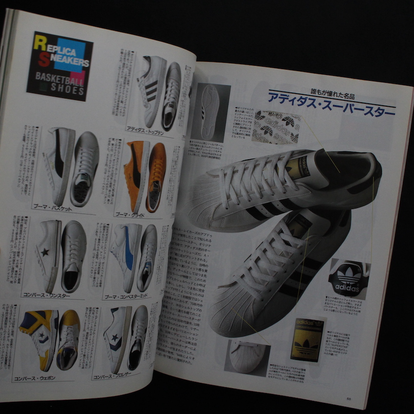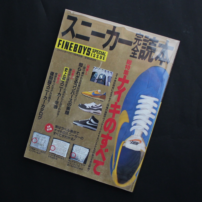 本書は、ヤング向けで1986年創刊、現在まで続くメンズ雑誌『Fineboys』のSpecial Issueとして95年に刊行された『スニーカー完全読本 ナイキのすべて』。アメカジブーム、スニーカーブームの中で、90年代に数多く雑誌でも紹介された「スニーカー特集」ですが、こちらは前半50ページくらいまではナイキ特集となっており、数々の歴代スニーカーから、ナイキのオレゴン本社、さらにはシューズ・デザイナーにもインタビューした凝った内容となっており、マニアックな情報も多数収録されている他、若かりし藤原ヒロシも登場します。その他アディダス、コンバースの名品なども紹介されており、写真も充実した一冊となっています。