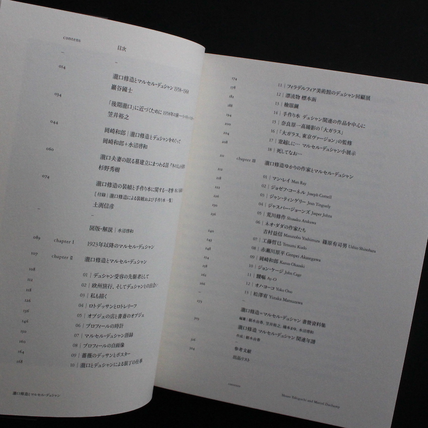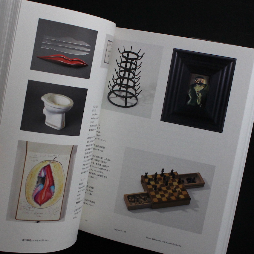 本書は、2011年に千葉市美術館で行われたエキシビジョン『瀧口修造とマルセル・デュシャン / Shuzo Takiguchi and Marcel Duchamp』を機に刊行されたカタログ。小ぶりな単行本サイズですが、350ページ近くにも及ぶ大著で、イラスト・図版も大変充実しております。余白たっぷりの白ベースのデザイン(森大志郎)も洒落ています。前衛美術、詩、写真、映画、デザイン、音楽など幅広い分野の芸術の現場に立ち会い、作家たちと交流を持ちながら評論活動を行なってきた瀧口修造。60年代以降は、批評からは距離を置き、文筆や造形活動を行うようになり美術家としても活躍。写真では大辻清司や岡上淑子ら多くのアーティストに多大なる影響を及ぼしました。そんな瀧口が、58年にサルバドール・ダリを訪れた際に、巨匠マルセル・デュシャンと運命的な出会いを果たし、以降は書簡や作品を通じて交流を継続。それは68年のデュシャン没後も、精神的な絆とつながりを保ち続けていたと言います。本展では、そうした瀧口とデュシャンの交流を、様々な作品や書簡等を通して紹介しています。