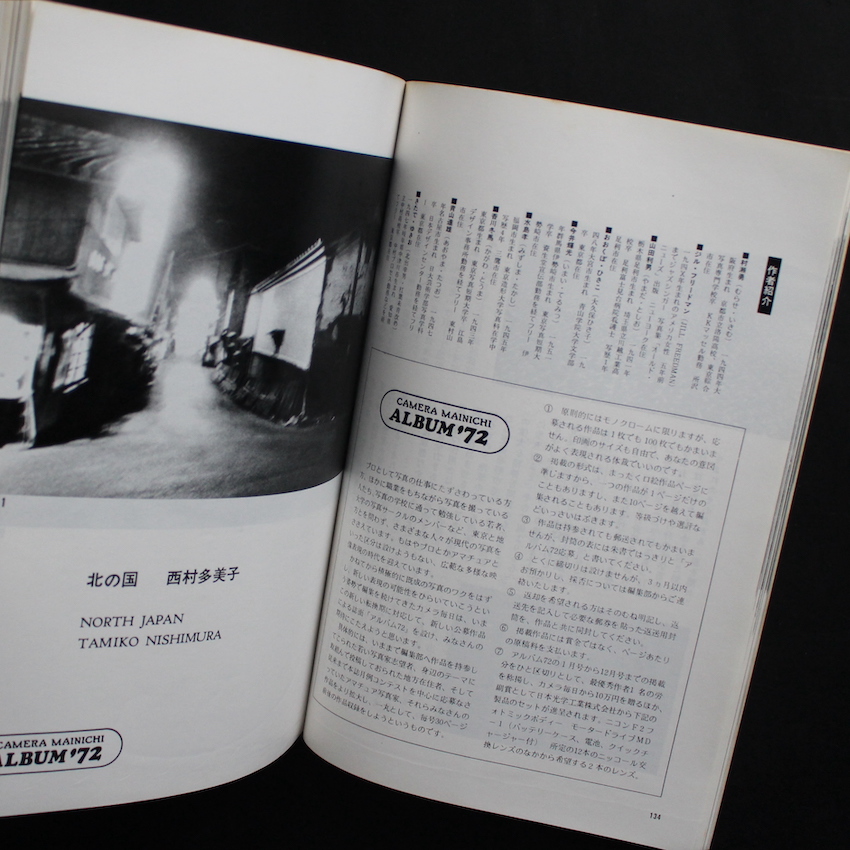 カメラ毎日が1970年代にプロ・アマ問わず公募した作品をまとめた「アルバム」シリーズの1972年度版の合本です。山岸章二のもとで編集を務めた西井一夫は、カメラ毎日及び山岸章二の70年代の最大の功績は、いち早くに「ダイアン・アーバスを日本に紹介したこと」そして「アルバムを確立したこと」であると自著『写真編集者 山岸章二へのオマージュ』(2002)で述べています。写真を楽しむアマチュアのみならず、プロを目指す写真家にとっても、アルバムに掲載されることがひとつの登竜門となっていた時期もあったそうです。本書でも、須田一政「天城峠」、西村多美子「北の国」、横木安良夫の(デビュー作)「Hellow, Good-bye」、小原健の「365」、山田利男「黒」「わが家のツバメ」などなど、70年代らしい「アルバム調」のイメージが連なります。