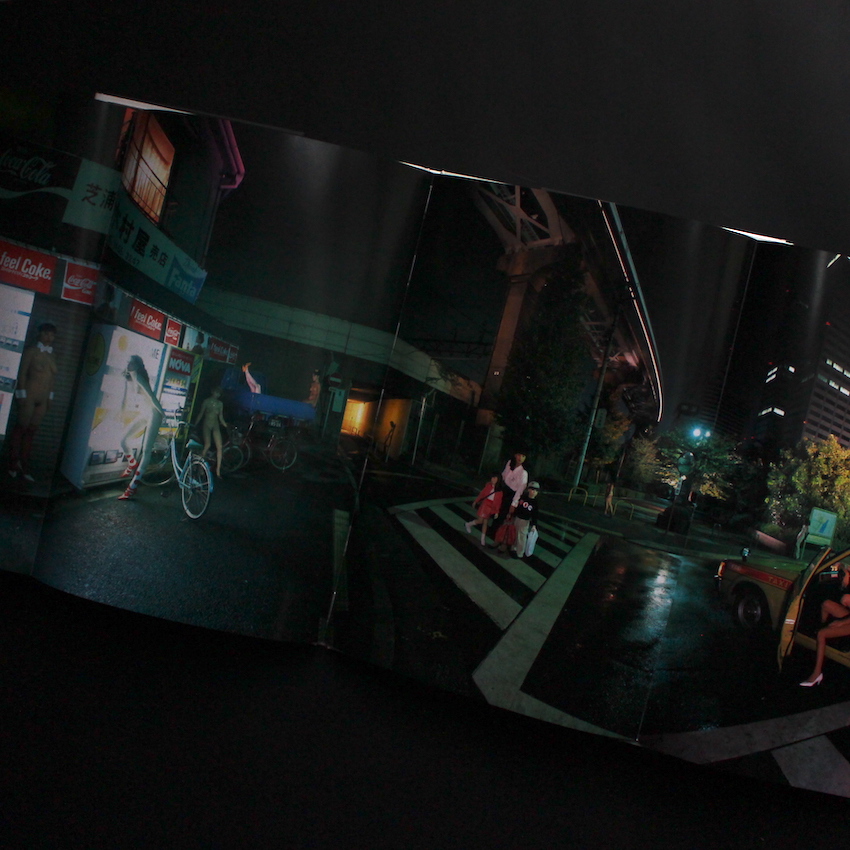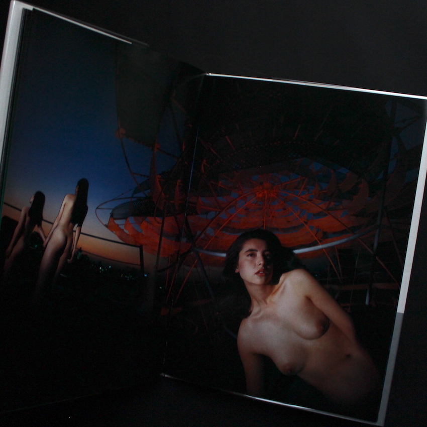 日本を代表する写真家・篠山紀信の作品集『Tokyo Nude(With OBI)』。1970年代から80年代にかけて、荒木経惟は、末井昭とタッグを組んで『ウィークエンドスーパー』や、爆発的人気を誇った『写真時代』などで話題をさらっていましたが、一方の篠山は、モデル・アイドル・女優らをモチーフにしたグラビアシリーズ『激写』がヒットとなり、篠山を中心とした写真雑誌『写楽』などが生まれました。また、コマーシャル活動と並行して取り組んだ、篠山の80年代の代表作と言えば「シノラマ」。その名の通り篠山の名と「パノラマ」を掛け合わせた造語ですが、複数のカメラを駆使して、複眼的に対象を捉える技法です。激変を遂げる80年代の(大)都市を写すには格好な技法であり、篠山はニューヨークや東京を舞台にした作品を発表してきました。こちらは「東京版シノラマ」ともいうべき、都市の風景とおんな(ヌード)を混在させ、東京という街を裸にした『Tokyo Nude』です。帯付。