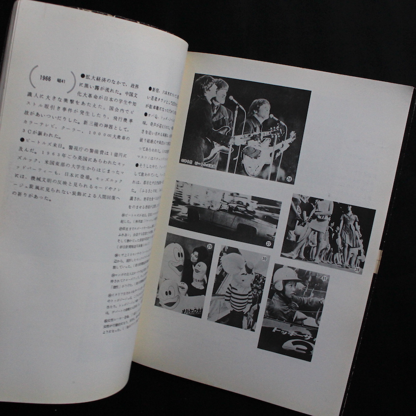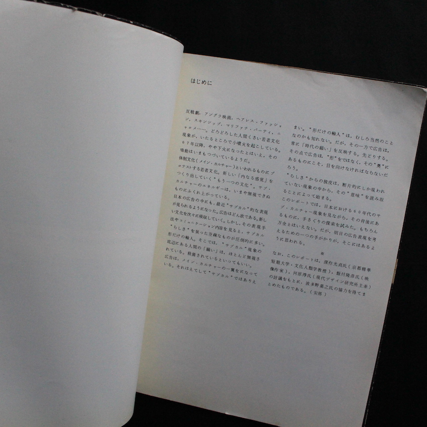 This book is a catalog published by Toyota Motor Sales, "Advertising Opinion Information Series No. 9 Subculture and Youth Toyota Motor Sales and Sales Expansion Department". This is described as an "internal document" and is a catalog that was likely published during the internal exchange of various opinions on advertising. The theme of this book is "subculture". Anti-war drama, underground movies, hairless, fashion, skinship, marijuana parties, Nyarome... In the 1960s, a muddy, human-smelling youth culture phenomenon erupted everywhere. While observing this phenomenon, the author attempts to explore what lies behind it and what its essence is, and is a book composed of text and photographs of various events that occurred each year from 1960 to 1970, when it gradually stagnated. The "Subculture Related Chronology" at the beginning of the book is also interesting, making it a worthwhile read.