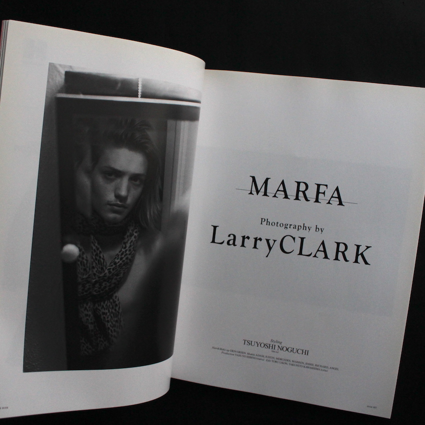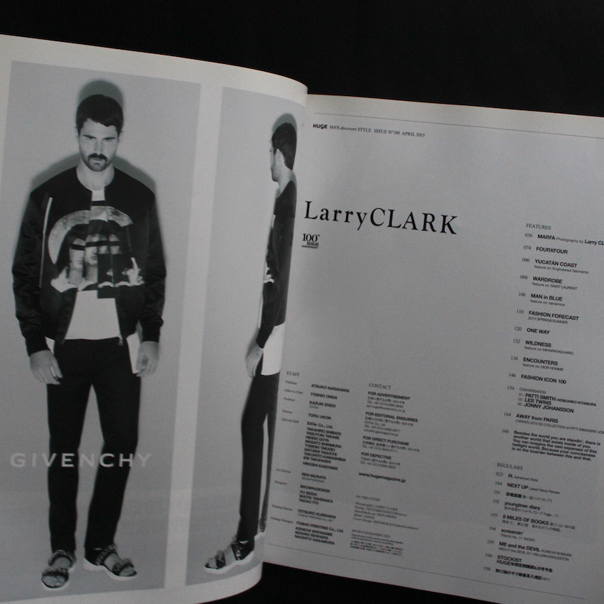 本書は、かつて講談社から刊行されていたメンズ向けのファッション・カルチャー誌『Huge』の創刊100号を記念して刊行された『HUGE No.100 April 2013 Larry Clark 100th Issue Anniversary』。その名の通り、20世紀のアメリカ写真界の巨匠ラリー・クラークの特集が組まれており、ウェブ配信のみで上映されたクラークの映画『Marfa Girl』をフィーチャー。メキシコ国境にほど近いMarfaは、ドナルド・ジャッドがアトリエを構えて、数々のマスターピースを創作した地であり、ジェームス・ディーンの遺作映画『ジャイアンツ』が撮影された地としも有名。そこの現地で知り合った少年アダムとの出会いが、映画の始まり。このアダムを主役に、地元の少年・少女たちを巻き込んだ素人たちが出演した、ある種いつものクラークらしいリアリティに富んだ映画作品です。そんな彼らをモデルにした写真やスチールが、本書で30ページ近く紹介され、そのスタイリングは野口強が担当しています。その他にもPatti Smithの特集や、野村訓市とWilliam Egglestonの2ショートおよびショートコメントなど、見応えのある一冊です。