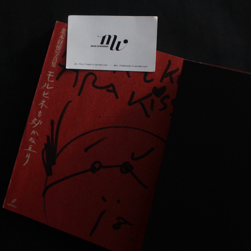 日本を代表する世界的な写真家・荒木経惟の写真集『モルヒネも効かぬ五月(Signed for Previous Owner)』。本書は、2004年の5月に撮影された写真で構成された1冊。1年間を写真日記的にまとめた写真集も多い荒木ですが、本書もまた時系列で写真はレイアウトされ、すべて縦位置の写真を採用。「『タテ位置』って面白いんだよ。組み合わせると意味が変わってくるじゃない。それが面白いの」と本書付録の『写真ノ説明』で荒木は語っていますが、見開きに2点並んだ写真の組み合わせの妙が、本書の肝にもなっています。自宅バルコニーでの愛猫チロに始まり、身辺雑記的なスナップの数々が続き、終わりも同じくバルコニーのチロという荒木らしい構成ですが、都内から山梨県小淵沢、仕事現場や仕事仲間、バーやクラブ、移動中(荒木流に言えばクルマド)と、荒木の行動とともに視点の移り変わりが、縦位置の写真でテンポよく組まれています。函付きの凝った装幀は鈴木一誌。題字は、本書の翌年(2005年)に発行となった荒木の写真集『空言』でモデルとなっている、乳がんで乳房を失った歌人宮田美乃里。謹呈署名入。