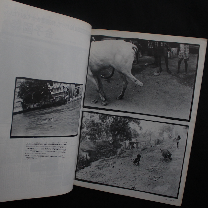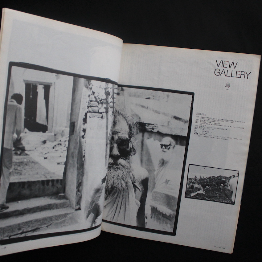 本書は、1980年代初頭に刊行されていたタブロイドのアート雑誌『Art View 創刊号・創刊2号・3&4合併号』。現代美術の価値が培われ始めた80年代に刊行された本誌は、国内で開催されるアーティストの個展の紹介から、アーティスト同士の対談、さらには作品も紹介されており、「写真」も「芸術」と認知されるべし(認知すべし)、第1号では大辻清司、第2号では若かりし畠山直哉、そして第3&4合併号では、深瀬昌久の作品が収録されており、深瀬はめずらしく、1ヶ月訪れていたいう「インド」で撮影された3イメージを紹介しています。「写真はぼくの商売だが、死ぬ迄の退屈しのぎだし、大義名分も将来への展望も持ちえない。恥ずかしいと思っている」(深瀬本人のテキストより)。