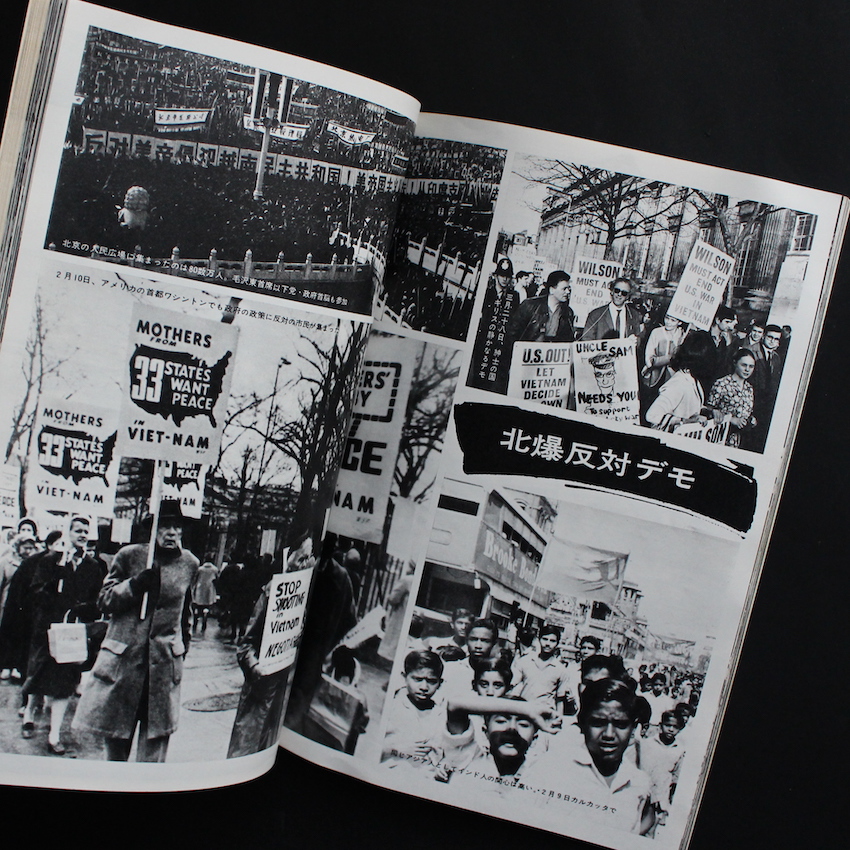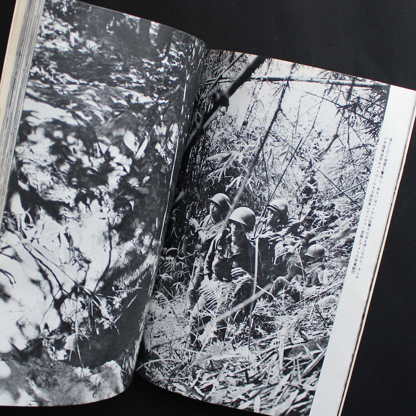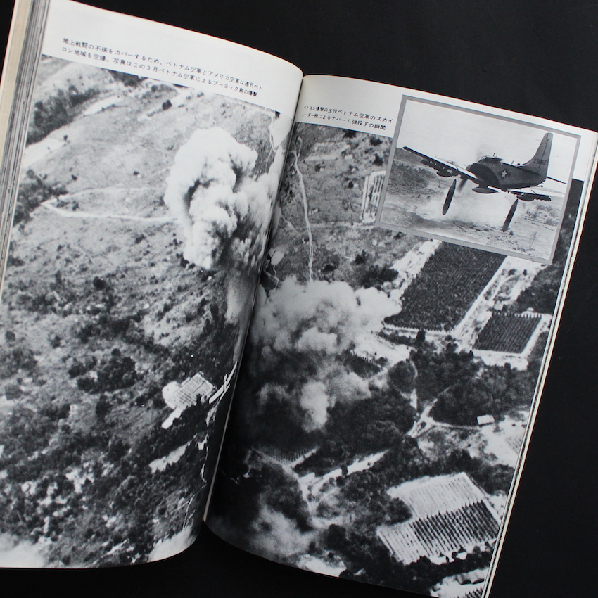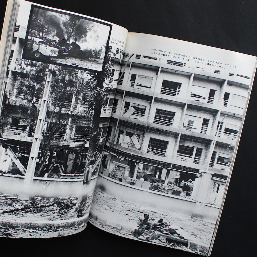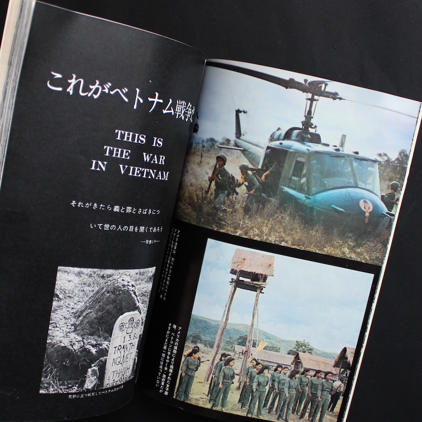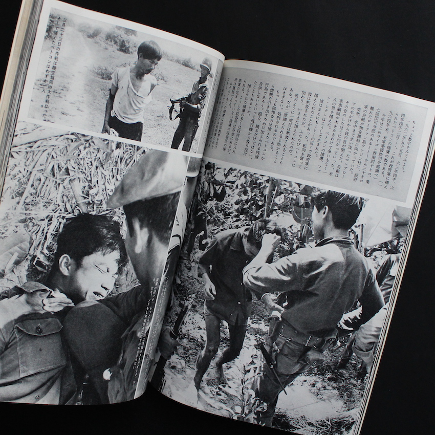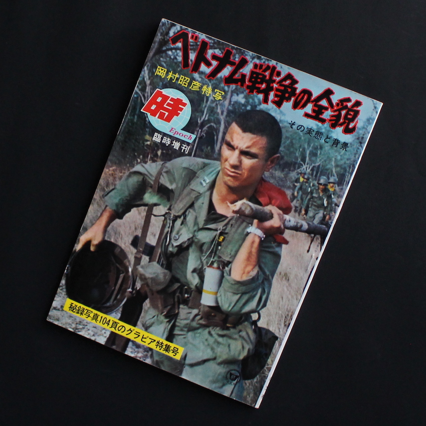 日本のジャーナリストで写真家・岡村昭彦撮影の作品集『ベトナム戦争の全貌 その実態と背景 岡村昭彦特写』。1929年東京・原宿生まれ、東京医学専門学校(現在の東京医科大学)中退後、様々な職や活動を転々として、61年に『新週刊』編集部に入り、土門拳らの知遇を得て、翌62年にPANA通信社へ入社。海外特派員としてバンコクに赴任、その途中で初めてカメラを購入、33歳にして写真家へと転向しました。以降、ラオスそしてベトナム戦争の取材を通じて撮影した写真は、世界各国のグラフ誌で紹介され、特にLIFEでは「キャパを継ぐ戦争写真家」として紹介されました。その後も精力的な取材を重ねていきますが、70年代後半以降はカメラから遠ざかっていき、1985年急逝されました。本書は、岡村撮影によるベトナム戦争の全貌が104ページに渡って紹介された一冊です。
