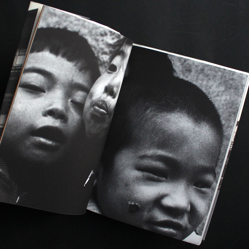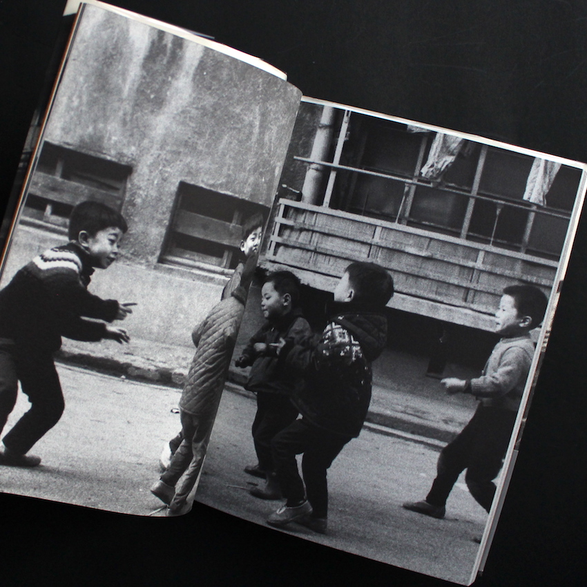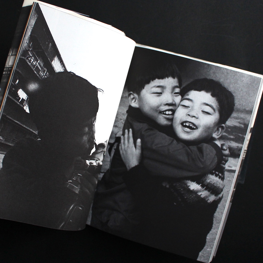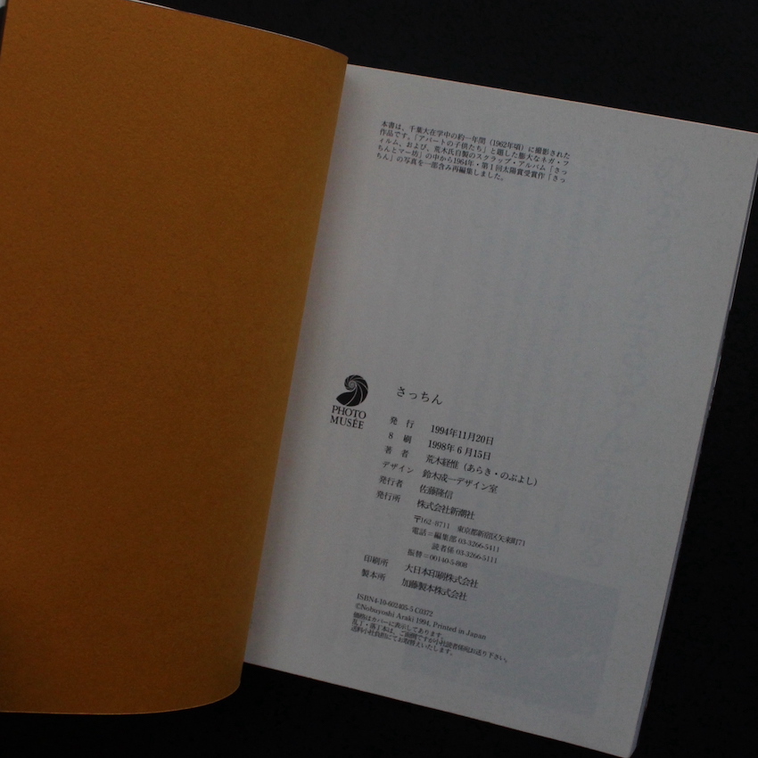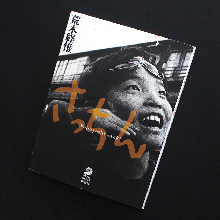 1960年代から活動を続け、喜寿を過ぎた現在も作品を発表し続ける写真家・荒木経惟の作品集『さっちん(Eighth Printing)』。実質的な荒木のデビュー作であり、第1回太陽賞を受賞した作品。下町の子供たちをモチーフにし、1年間撮影を続けたドキュメント。当時、木村伊兵衛・原弘らが太陽賞の選考委員となっていますが、同じくその一人であった渡辺義雄のコメントを抜粋。「一見仕上げのわるいみばえのしない作品のようだが、暗調のあらっぽい面に子どもが生き生きと躍動している姿には捨てがたい魅力がある。カメラと子どものいきがぴったりとあって奔放な動きの中にマスコミが教育される子どもの現代知識がうかがわれて、いわゆる現代っ子の世界の一面が表れている点にひかれた。また都会の下町的環境がいっそうそれを効果づけている」。1998年刊行・第8刷。帯欠。