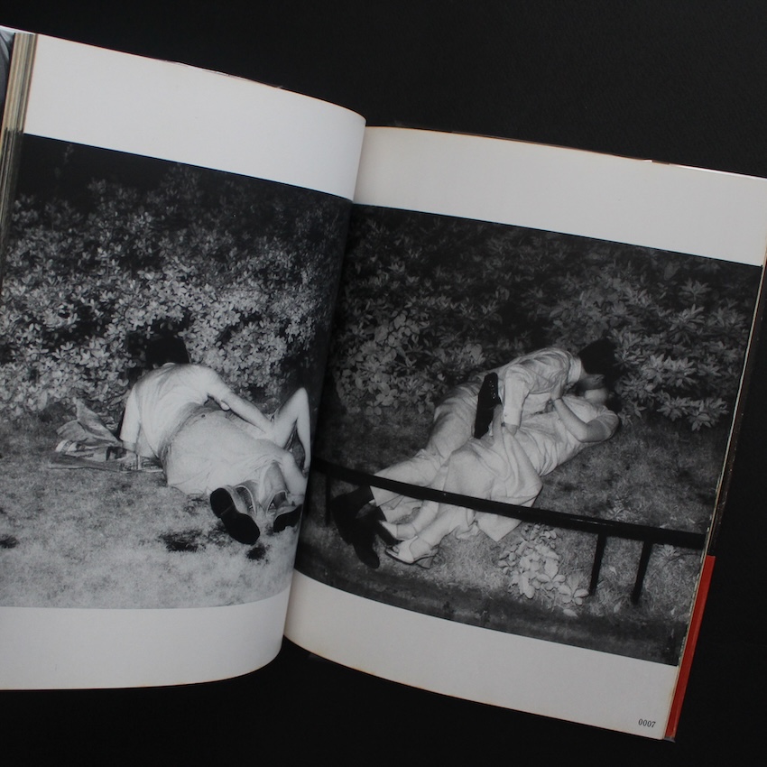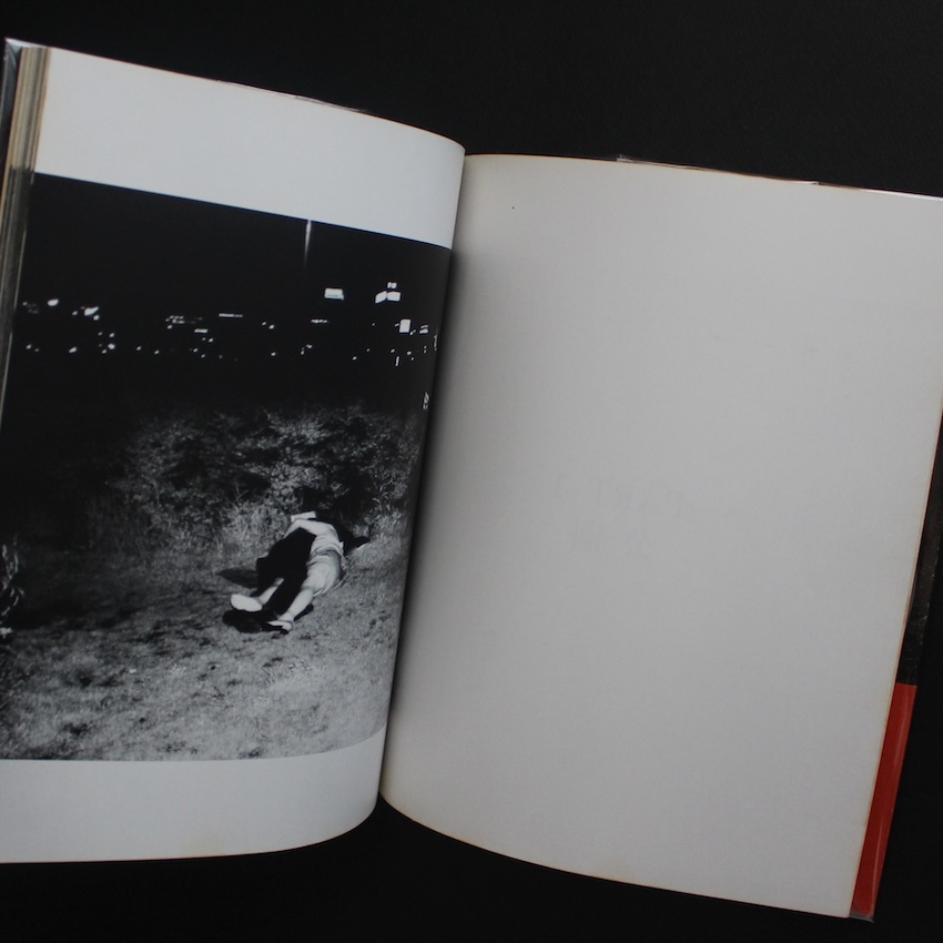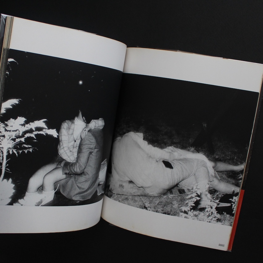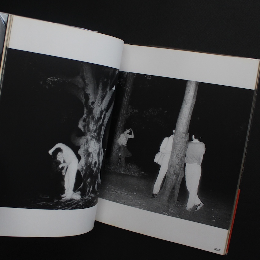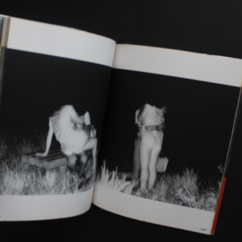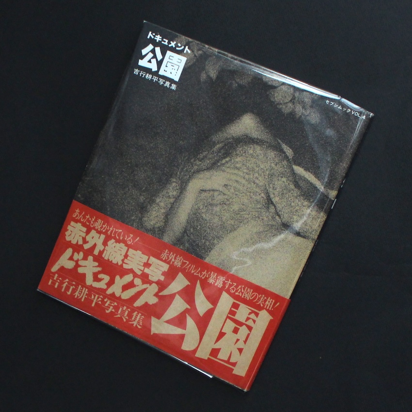 日本の写真家・吉行功平の写真集『ドキュメント 公園 / Document Park(First Printing, Red OBI)』。1970年代より活躍する吉行は「覗き見」写真家の第一人者。舞台は新宿西口・中央公園そば。当時は高層ビルもまだ立ち並んでいなかった時代、撮影の帰りの夜道で偶然目にしたカップルのラブ・シーン。昼間は子供たちの遊び場である場所が、夜になると大人の遊び場に。その街の変貌ぶりに興味をもった吉行は、以来夜の公園に通いつめ、赤外線カメラを通じてカップルの痴態の接写に取り組みます。すると、そのカップルたちを覗き見する男たちが集まり、さらには代々木公園や神宮まで足を伸ばすと、今度はホモたちの溜まり場にも遭遇。男女のカップルに限らず、男男のカップル、さらには彼らを覗き見する男たちまでも写し込んだ「(夜の)公園」ドキュメント。倫理的な問題はともあれ、類を見ない作品の数々は、世界的な写真関係者の目に留まり、コレクターズ・アイテムとして人気の絶えないものとなっています。荒木経惟との対談収録。初版・第1刷(赤帯)。