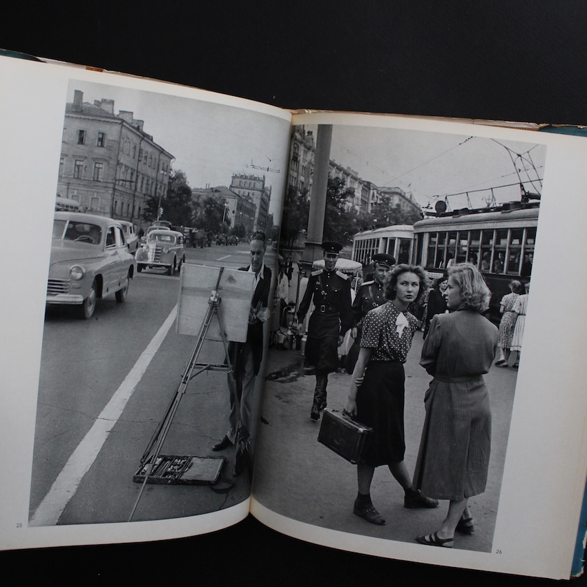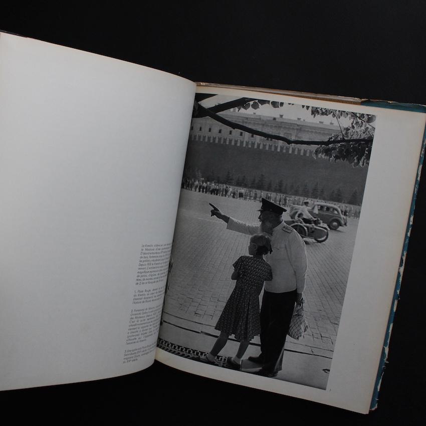 フランスの写真家アンリ・カルティエ=ブレッソン(Henri Cartier-Bresson, 1908–2004)の写真集『Moscou』。同年に英語版『The People of Moscow』ととして刊行されたフランス語版です。ちなみにフランス語版は、名編集者ロベール・デルピールが主宰するÉditions Neufから出版され、戦後写真出版における大きな足跡を残しました。収録された163点のモノクロ写真は、冷戦下の緊張感漂うソ連を舞台に、市井の人々の暮らしや街の光景を「決定的瞬間」として切り取っています。労働者や子どもたち、広場に集う市民の日常を、プロパガンダを超えて普遍的な人間の営みとして描き出し、都市の息遣いと人間的な温かみを伝えています。フランス語版『Moscou』は、デルピールの洗練された編集とレイアウトによって写真集というメディアの芸術性を高め、カルティエ=ブレッソンの名をさらに国際的に確立させる役割を果たしました。本書は、写真家と編集者双方の視点が融合した歴史的名著です。(カバー裏面補修大、及び記名あり)