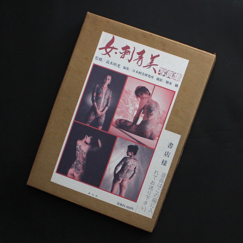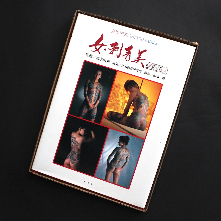 本書は、1980年代から90年代にかけて恵文社より刊行された「Japanese Tattoo Ladies」シリーズの第1号『女・刺青美 / Japanese Tattoo Ladies』。女性に施された個性的な刺青の数々がカラー写真で多数紹介された良書です。写真を担当したのは、80年代を席巻した雑誌『写真時代』などにも登場する写真家・樹水駿。また、紹介された刺青は、初代彫俊、初代彫長、初代彫巳乃、初代彫徳、三代目彫よし、初代彫妻、三代目彫政、三代目彫銀、初代彫九、彫たけ、初代彫和歌、初代彫国、初代彫辰らの作品が紹介されています。「本来、刺青は女性に合っているのかもしれない。針の苦痛に耐え抜いて無垢な素肌が華麗な艶肌に刺青変化するさまは、さなぎから脱皮した胡蝶の羽に彩りもたとえられ、この美しさ妖しさは、女刺青の極めといえる」(小説家・高木彬光の序文より)。輸送箱付属。