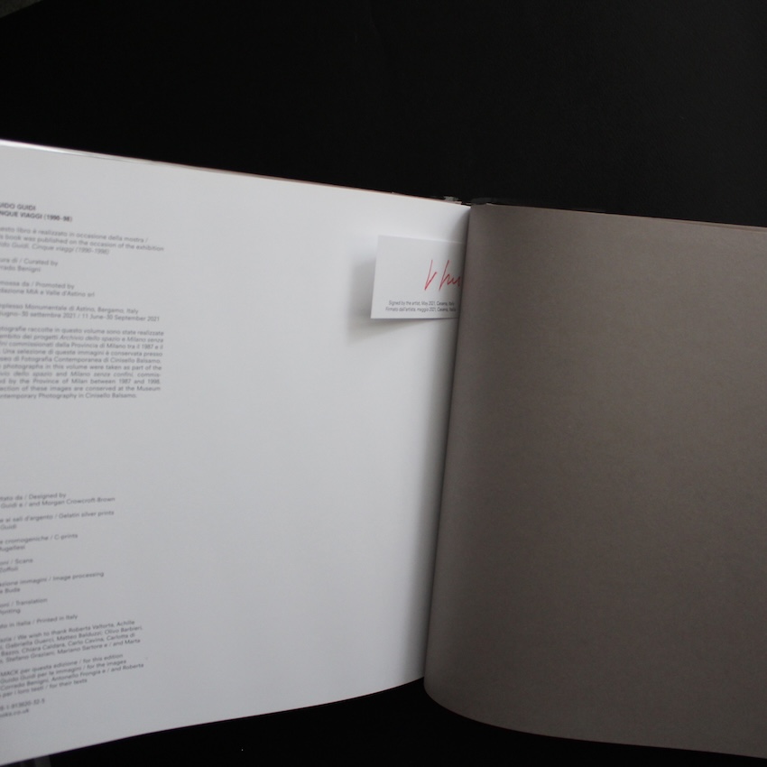イタリアの写真家グイド・グイディ(1941-)の作品集『Cinque viaggi (1990–98)』。グイディは建築や都市の変容を静謐に見つめる視線で知られ、カラー写真の可能性を探求しながら、戦後イタリアの風景に独自の詩情を与えてきた作家です。彼のカメラは華やかな被写体よりも、郊外の道路や廃墟、何気ない建物の外壁といった周縁に向けられ、その土地に刻まれた時間や人々の営みを丹念に掬い上げます。本書は1990年から98年にかけてミラノやその周辺を5度にわたり旅した記録で、都市の中心から郊外へと視点を移しつつ、社会の変化や日常の断片を写真に定着させています。110点に及ぶ未発表作を含む図版は、イタリアが近代化と脱工業化を経験する中で生まれた「ありふれた風景」の豊かさを再考させ、写真が持つ記録性と詩的想像力の両義性を鮮やかに示しています。写真家サイン入り。