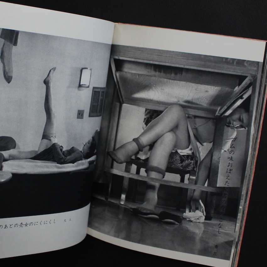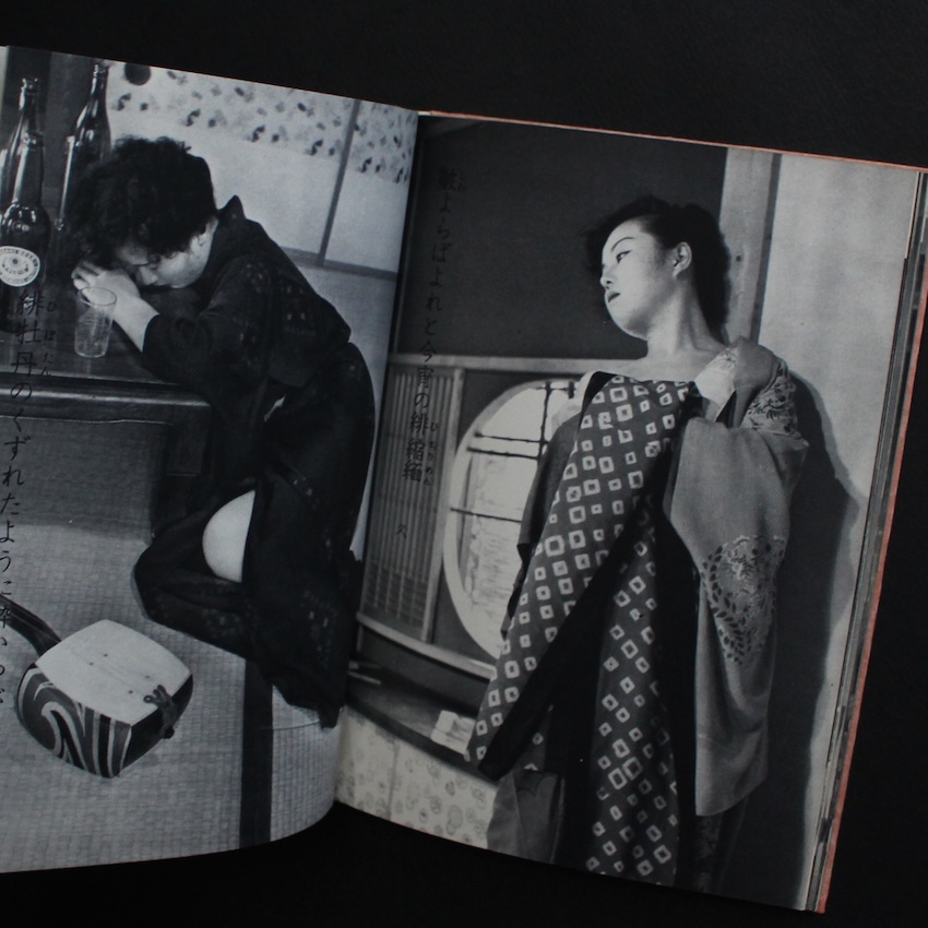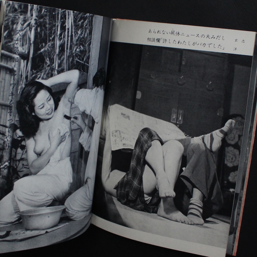 日本の作者による『風流写真川柳集』(新流社、昭和三十六年刊)。写真と川柳を組み合わせた一冊ながら、収録される写真は女性モデルに特化しており、当時のグラビア文化と軽文芸が交差する“昭和の風流”を体現した小出版物です。ヌードや半裸が含まれるものの、露骨な刺激ではなく、視線を誘う仕草や身体の曲線、化粧や装いの余韻といった「見立ての美」を重んじた構成が特徴で、昭和初期から続く艶笑文化の系譜に連なりつつ、下卑た印象を避けた静かな官能が漂います。添えられる川柳は、軽やかさで写真の世界を和らげたり、逆に僅かに含ませたりと、視覚と文芸が互いの余白を引き出す役割を担い、当時の大衆文化に特有のユーモアや情緒をそっと呼び起こします。女性像を一方的に消費するのではなく、季節感・しぐさ・間合いといった日本的な“風流”に寄せて表現することで、ヌード表現と川柳が品を保ちながら同居しており、写真文芸が持ち得た柔軟さと遊び心をよく示す一冊といえます。昭和三十年代の小出版社だからこそ生まれ得た、希少な文化の断片として今も独特の魅力を放っています。
