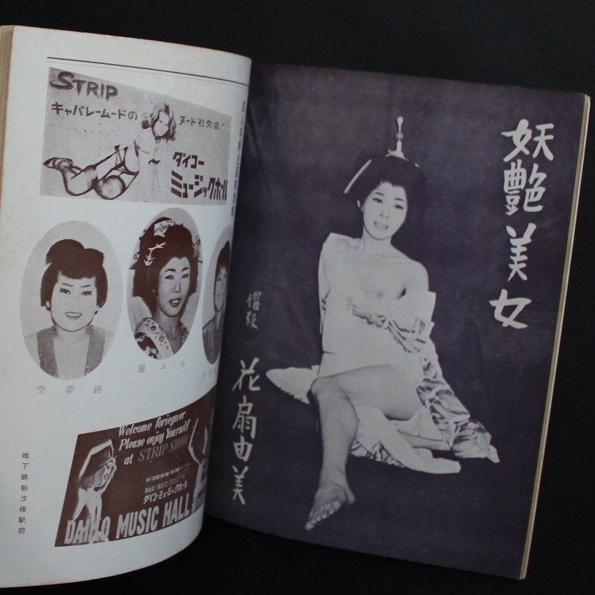 ストリップ専門誌として1966年(昭和41年)に中谷陽が創刊した『ヌード・インテリジェンス』の「5号 耽美号」。 当初は実演レポートや劇場情報を扱う硬派なストリップ誌として出発し、ショー文化の成熟とともに誌面は独自のグラビア表現へと広がっていきました。1976年(昭和51年)に通巻50号を迎えると、表紙ロゴが“NU・IN”へ刷新され、誌面デザインもより視覚性を重視した構成へ移行します。写真のレイアウトやデザインが個性的で、モデルのポーズを大胆にトリミングした構図、カラーページの強い発色などが特徴となり、“昭和のストリップ”が持っていた様式美と即興性がそのまま紙面に刻まれています。読者投稿や短編小説を織り交ぜつつ、主要コンテンツはあくまでストリッパーの身体と舞台表現に焦点を当て、職業としてのストリップを日常的な文化として記述し続けた点でも特異な存在でした。1982年(昭和57年)に終刊しましたが、艶笑誌とも一般的な写真雑誌とも異なる“舞台文化の記録媒体”としての姿勢は他に類例が少なく、今日では雑誌史・風俗史双方から貴重な資料として評価されています。