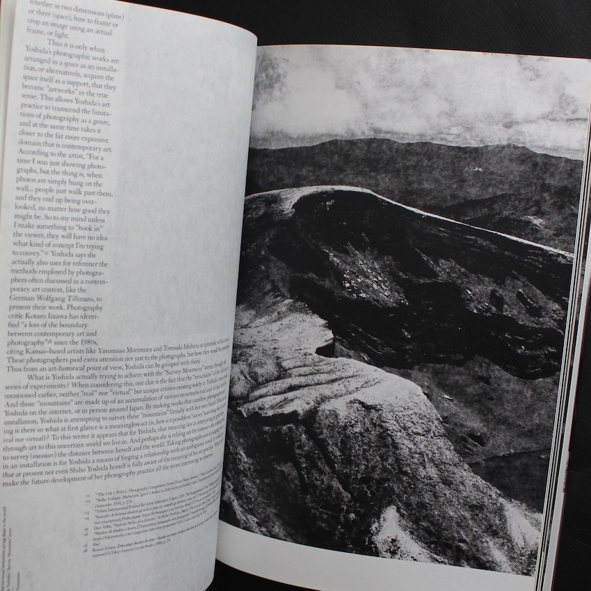 日本の女性写真家である吉田志穂(1992-)の作品集『測量|山 / Survey: Mountains』。2014年に行われた第11回写真 「1_WALL」でグランプリを受賞して以来行ってきた数々の個展やインスタレーションでも注目を集めてきた吉田志穂。21世紀世代とも言える「インターネット」を駆使して、気になる土地や画像を検索し、マークやいいねのごとくその画像はフィルムに収め、それから実際に当地を訪れて撮影を行います。そして、収集した画像、自身の撮影イメージを織り交ぜ、高くしたり低くしたり、ぶら下げたり、おいたり、大きくしたり小さくしたりと、ティルマンスの展示のごとく、それら一連を「作品」として仕上げていきます。ネットを用いて、デジタルもアナログも駆使し、いち写真に限らないトータルな演出を「作品」に昇華させていくという、ある種現代的で、さらには次代の写真表現を問うスタイルが未来を期待させるアーティストです。そんな吉田のファーストブックは「山」をテーマとしており、視覚的な美しさやインスタレーションの風景も織り交ぜたイメージで構成されており、第46回木村伊兵衛写真賞へと至った作品群です。小池俊起によるブックデザイン。