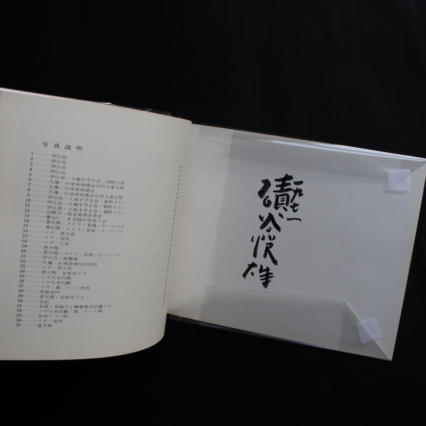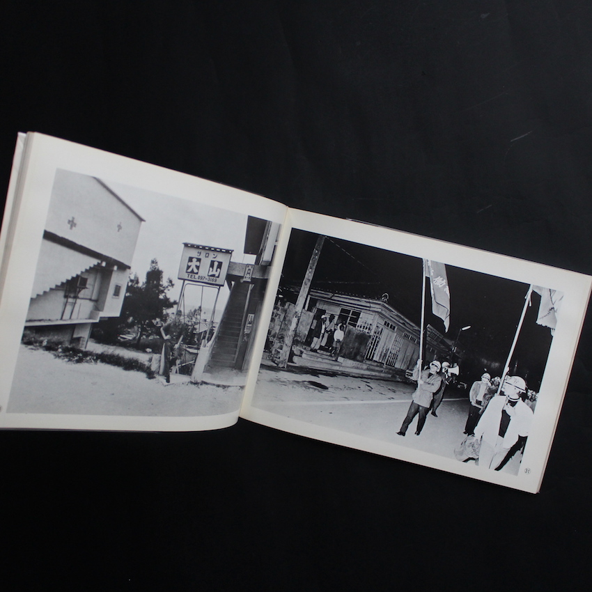 こちらは沖縄の本土復帰前、1971年・秋にアノニマスな写真家(『The Japanese Photobook 1912–1990』では「Student Collective」との表記あり)によって刊行された写真作品集。おそらくは、専門学校または大学の写真学生らによるものと思われますが、「沖縄問題」「沖縄問題」とは言いながら、当事者意識もない自分たち本土の人間が、「沖縄」の現実について思い、考えを改め、何か行動しなければならない、という思いから出版に至ったような一冊。至る所が「アメリカニゼーション」と化して、英語の建物やサインが蔓延する那覇市内、本島にあるペプシコーラの製造工場、米国人と日本人が混在する家族、コザ暴動、地元民によるデモなどなど、本土とはかけ離れた沖縄の実情を写し出しています。また、コザ反米行動の一連をコンタクトの複写によって表現したり、モノクロや縦横に工夫を凝らしたレイアウトなど、「写真集」としてのこだわりも随所に感じさせる内容となっており、作り手の思いも感じられる素晴らしい一冊です。(写真家のクレジットの記載はありませんが、磧谷悦雄の刊行年次入り署名入りで、磧谷の図版が使用されていると思われます)